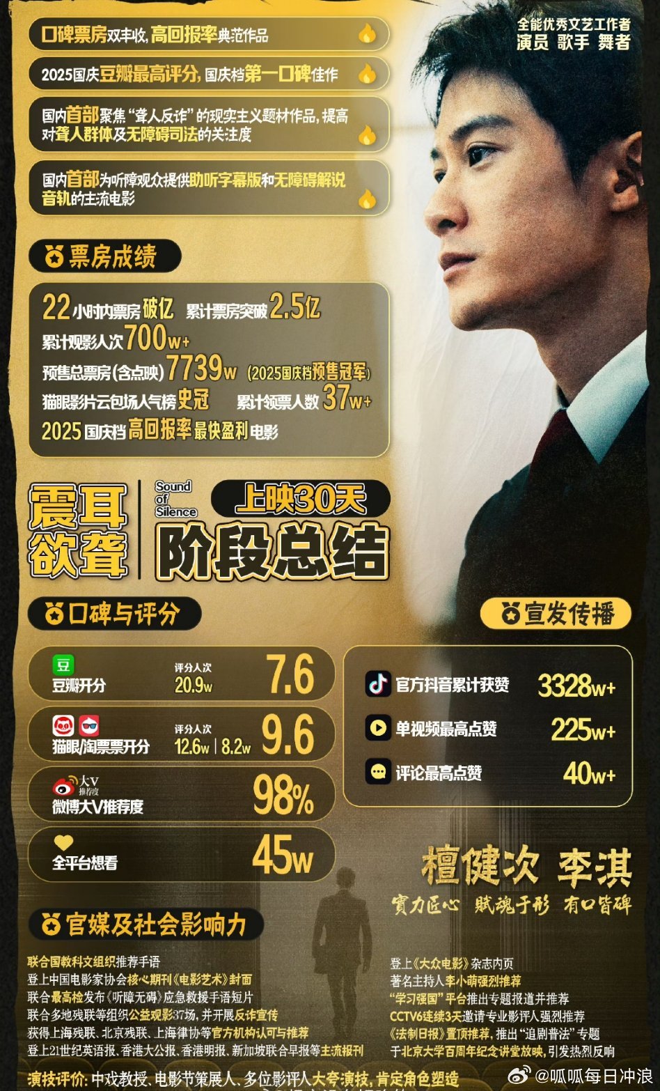 檀健次《震耳欲聋》上映30天战报荣誉,票房破2.5e,评分口碑各项都很稳。