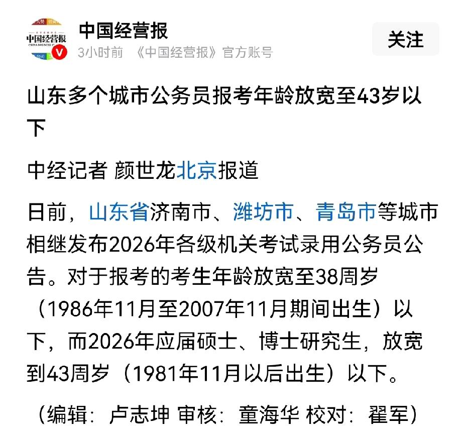 山东考生有福了,超过35岁还有机会考公,甚至43岁还有机会。 山东不少城市,比如济南、潍坊、青岛等考公年龄已经放宽到38岁,如果是应届硕士博士,还可以放宽到43岁。 38岁以下还可以试试,如果超过38岁,比如40岁了,可以这样曲线考公:随便找个高校考个研究生,三年后毕业以应届毕业生的身份考公,可以享受最高43岁的。 当然这也不是没风险,最大的风险就是考不过年轻人。除非去报那些偏远没人愿意去的地方。