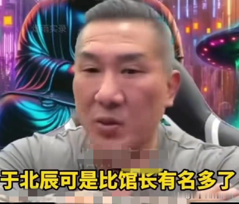 馆长说到了大陆才知道,原来于北辰比他出名多了。 于北辰还是个将军,他的很多“名言”大陆朋友都烂熟于心啊!什么“导弹拦截率210℅”,“没有红绿灯找不到路”,“躲在冰箱里找不到了”,“躲在厕所里不出来”,更可笑的是“把于北辰的北字去掉就找不到他了”! 馆长说完,自己都笑趴下了。他说一个将军都这样,士兵还有啥战斗力?还说于北辰要是年轻几十岁,可以去做喜剧演员了。 实际上根本不是这样的,于北辰来了和馆长来了是两回事。馆长来了大家很敬重他,因为他是为了祖国统一来的。 于北辰如果来了,那是要圈起来卖票的。