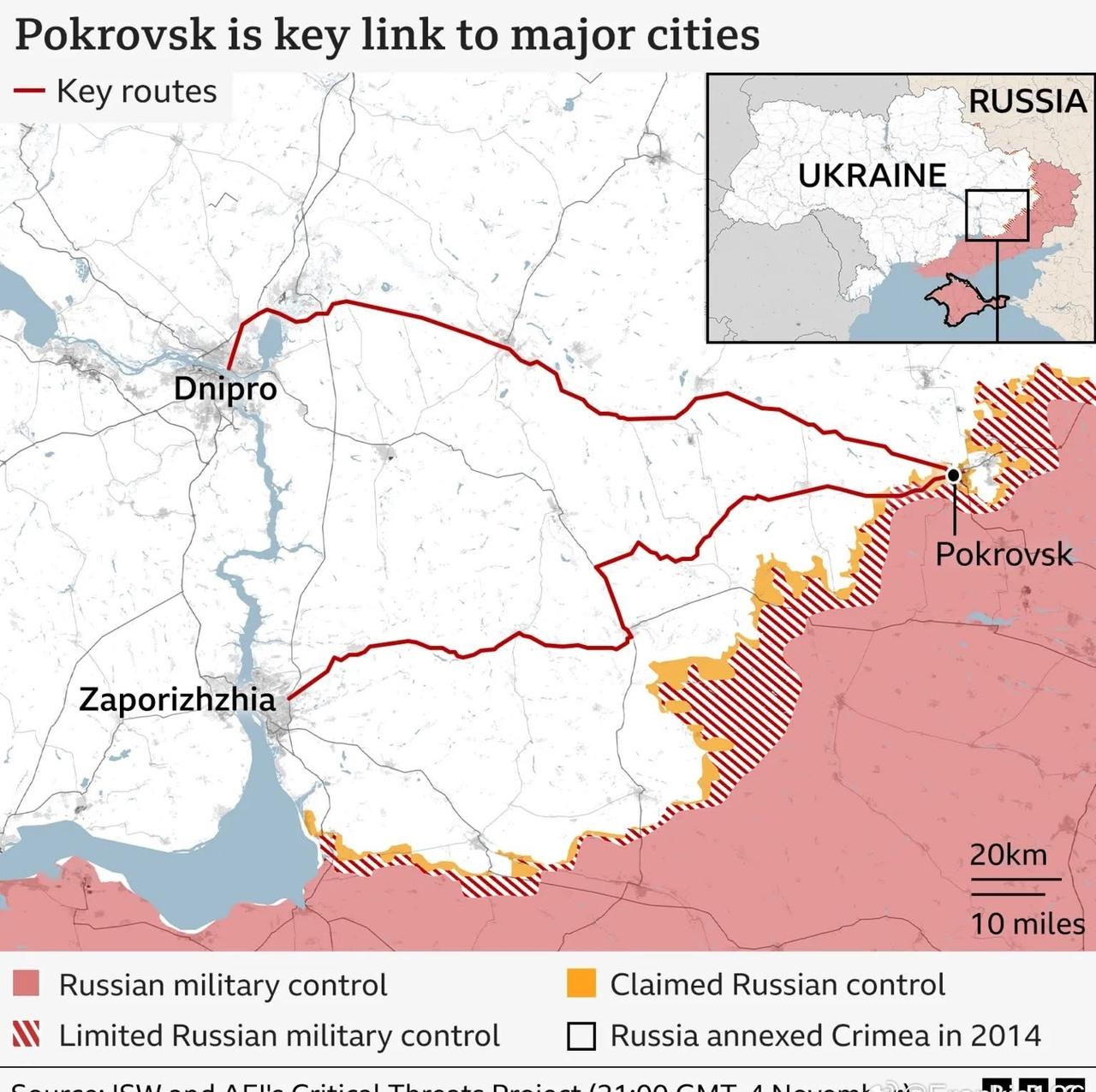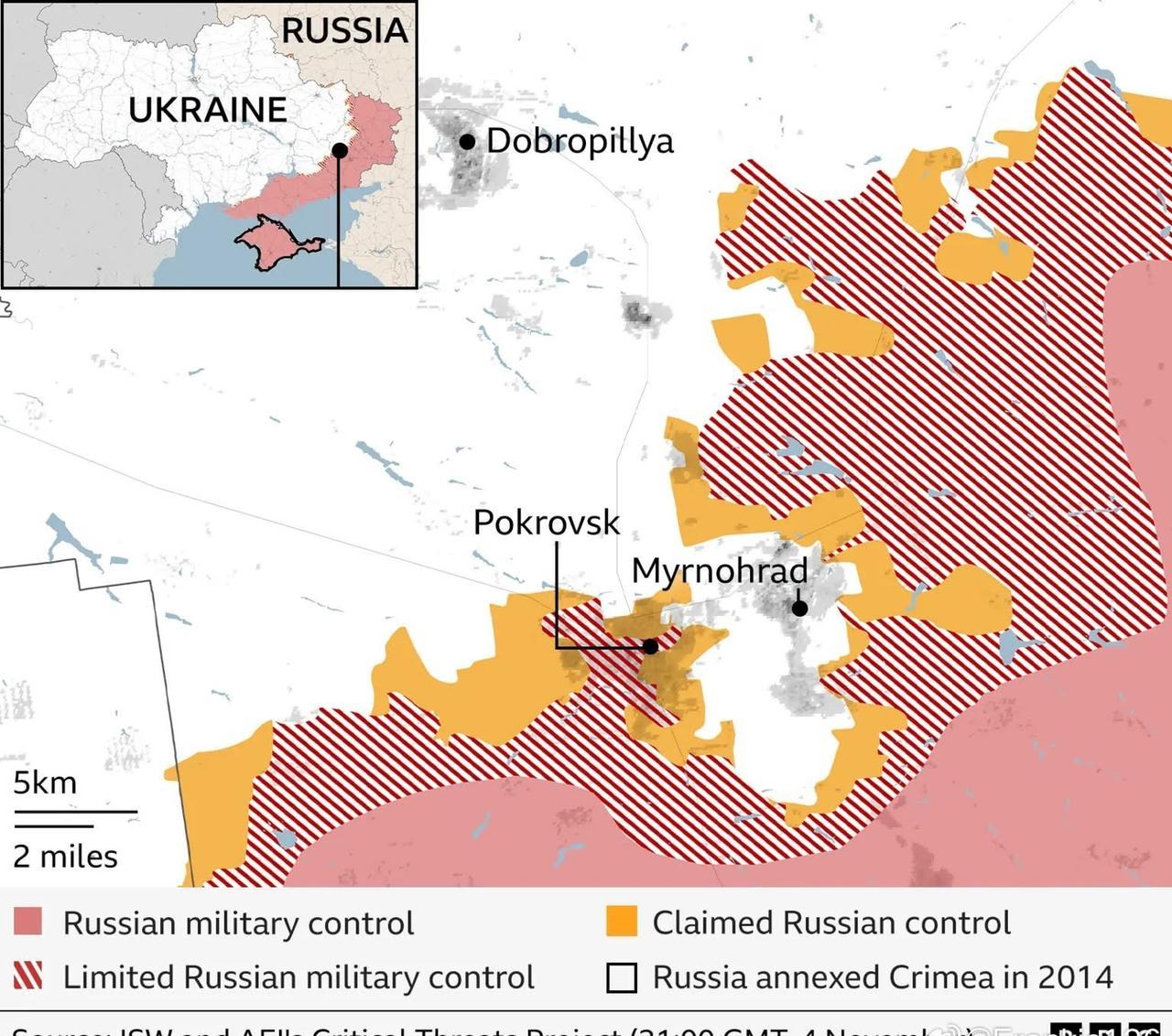11月5日,烏軍 425th Separate Assault Regiment 收復被俄軍佔領的 Pokrovsk 市議會大樓並升起烏國旗。 打了15個月,據報普京下了命令要在11月完全佔領,而且在早前記者招待會表示已經完全包圍的 Pokrovsk 戰鬥,烏方稱俄軍出動170000人,俄、烏兵力是10:1 ,俄方由3面進攻,部分俄軍已經進城,烏軍派出精銳部隊作支援及正進行清剿。 有分析指過去3個月俄方每月平均傷亡3萬人,其中主要原因是沒有坦克、重型裝備支援,而只能徒步的步兵就出現行動、調動緩慢。