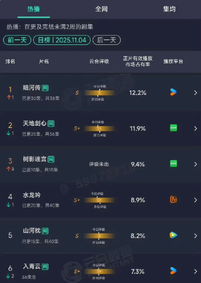 成毅的《天地剑心》云合登顶几天之后,龚俊的《暗河传》终于超过成毅的《天地剑心》云合登顶了,两大男主的剧虽然播的都很一般,但好在谁也没有被谁甩开很远,不至于差距太明显。