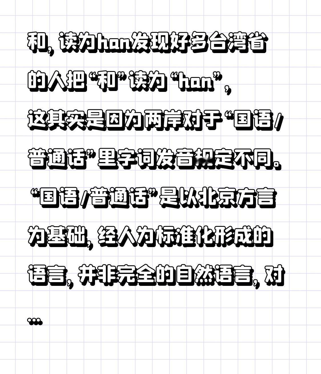 和,读为han 发现好多台湾省的人把“和”读为“han”,这其实是因为两岸对于“国语/普通话”里字词发音规定不同。 “国语/普通话”是以北京方言为基础,经人为标准化形成的语言,并非完全的自然语言,对很多地方包括台湾以及大陆不少地方的人来说,它是外来语言。经过几代人,大家容易觉得这发音天经地义。所以台湾省人把“和”读成“han”,就是这种发音规定差异的体现。这就像不同地区对同一事物有不同叫法一样,是语言发展和规定不同带来的有趣现象。