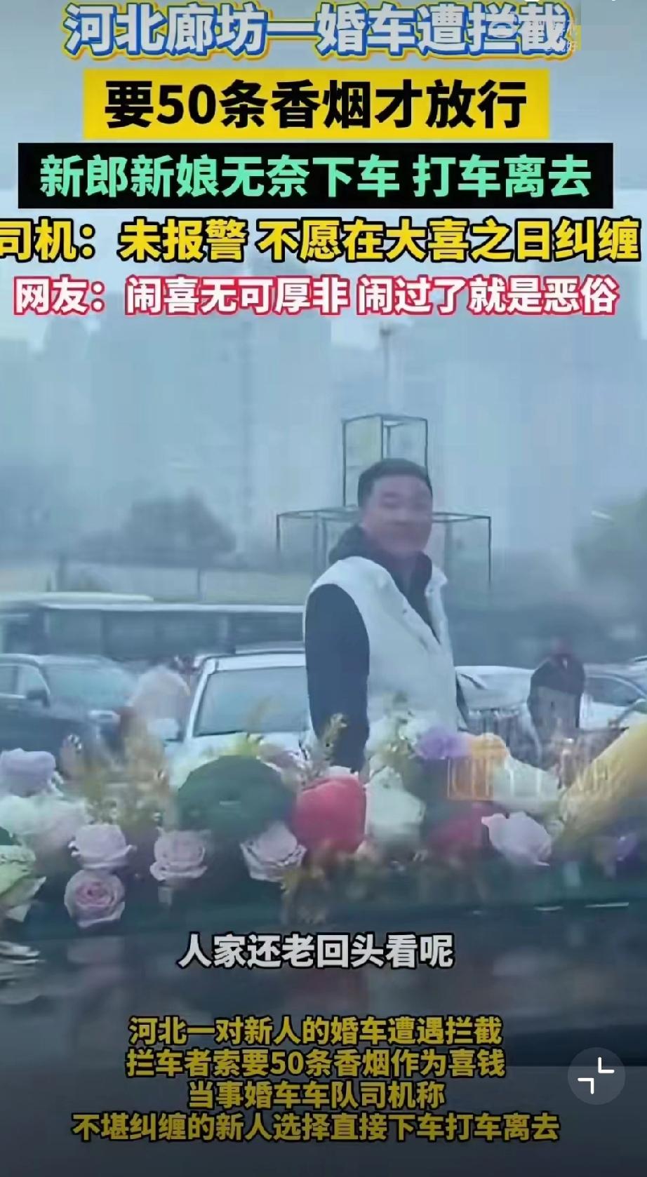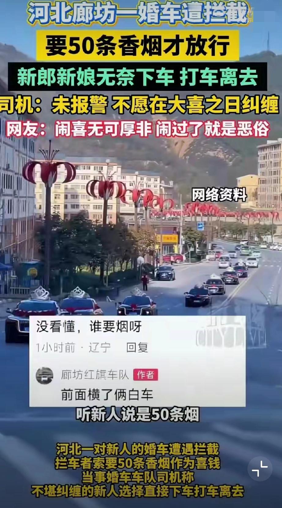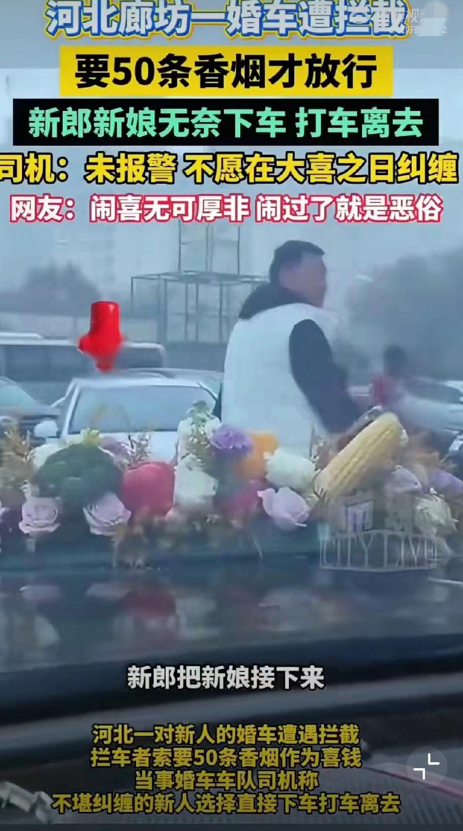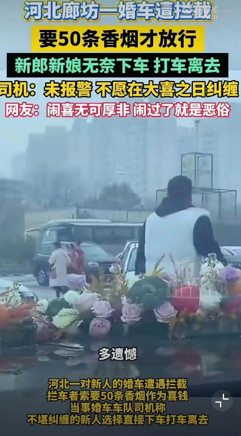 11月5日,河北廊坊,网友发视频称新人结婚时遭拦车的要50条喜烟! 无奈打车离开(来源:廊坊红旗车队)。 原始视频已消失,不过11月6日,廊坊红旗车队又发了一个视频,称一百来号人,这场面不小啊。婚礼拦车要红包 马路上拦婚车 拦婚车陋习