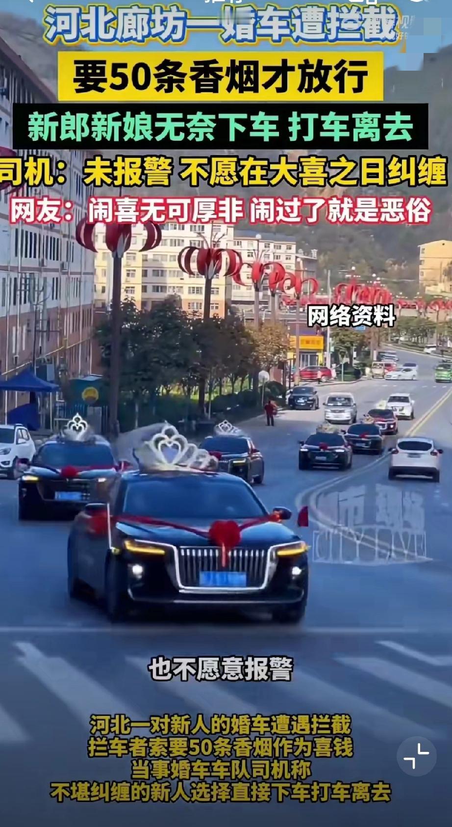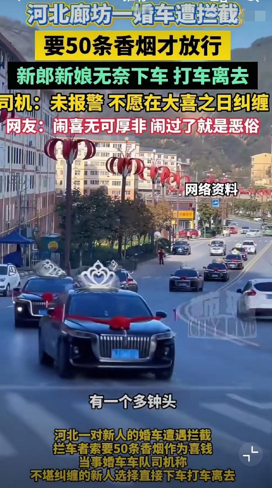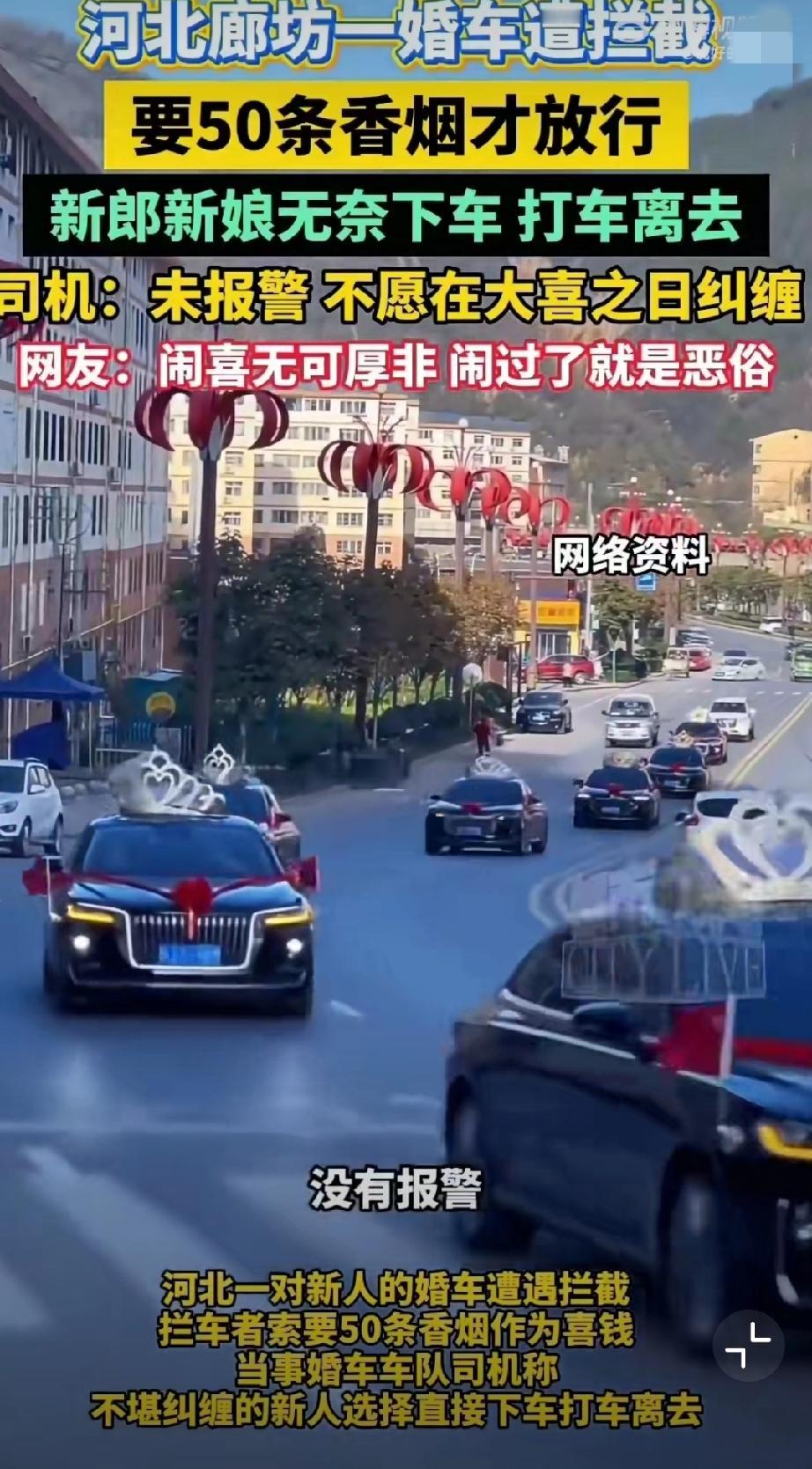 11月5日,河北廊坊,网友发视频称新人结婚时遭拦车的要50条喜烟! 无奈打车离开(来源:廊坊红旗车队)。 原始视频已消失,不过11月6日,廊坊红旗车队又发了一个视频,称一百来号人,这场面不小啊。婚礼拦车要红包 马路上拦婚车 拦婚车陋习