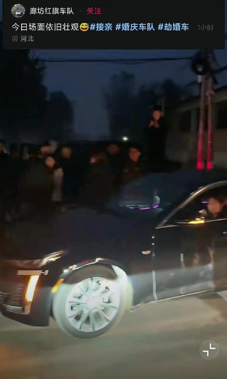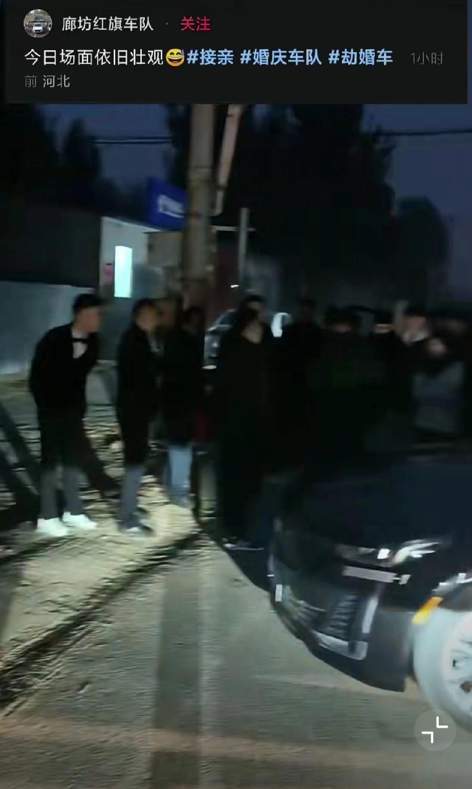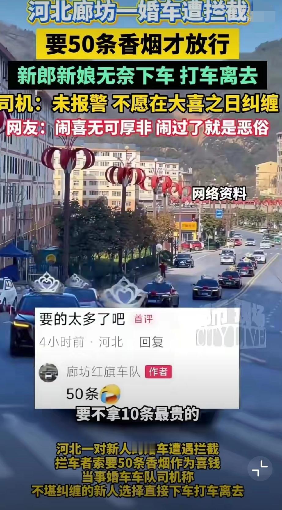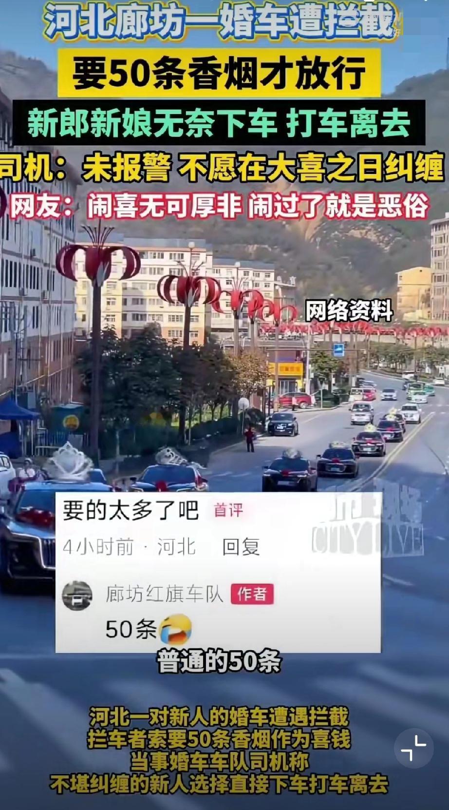 11月5日,河北廊坊,网友发视频称新人结婚时遭拦车的要50条喜烟! 无奈打车离开(来源:廊坊红旗车队)。 原始视频已消失,不过11月6日,廊坊红旗车队又发了一个视频,称一百来号人,这场面不小啊。婚礼拦车要红包 马路上拦婚车 拦婚车陋习