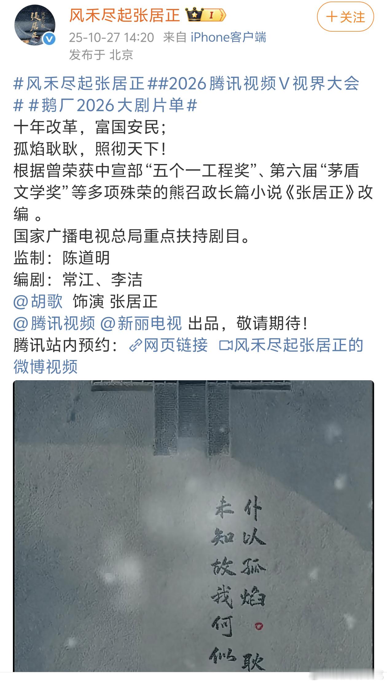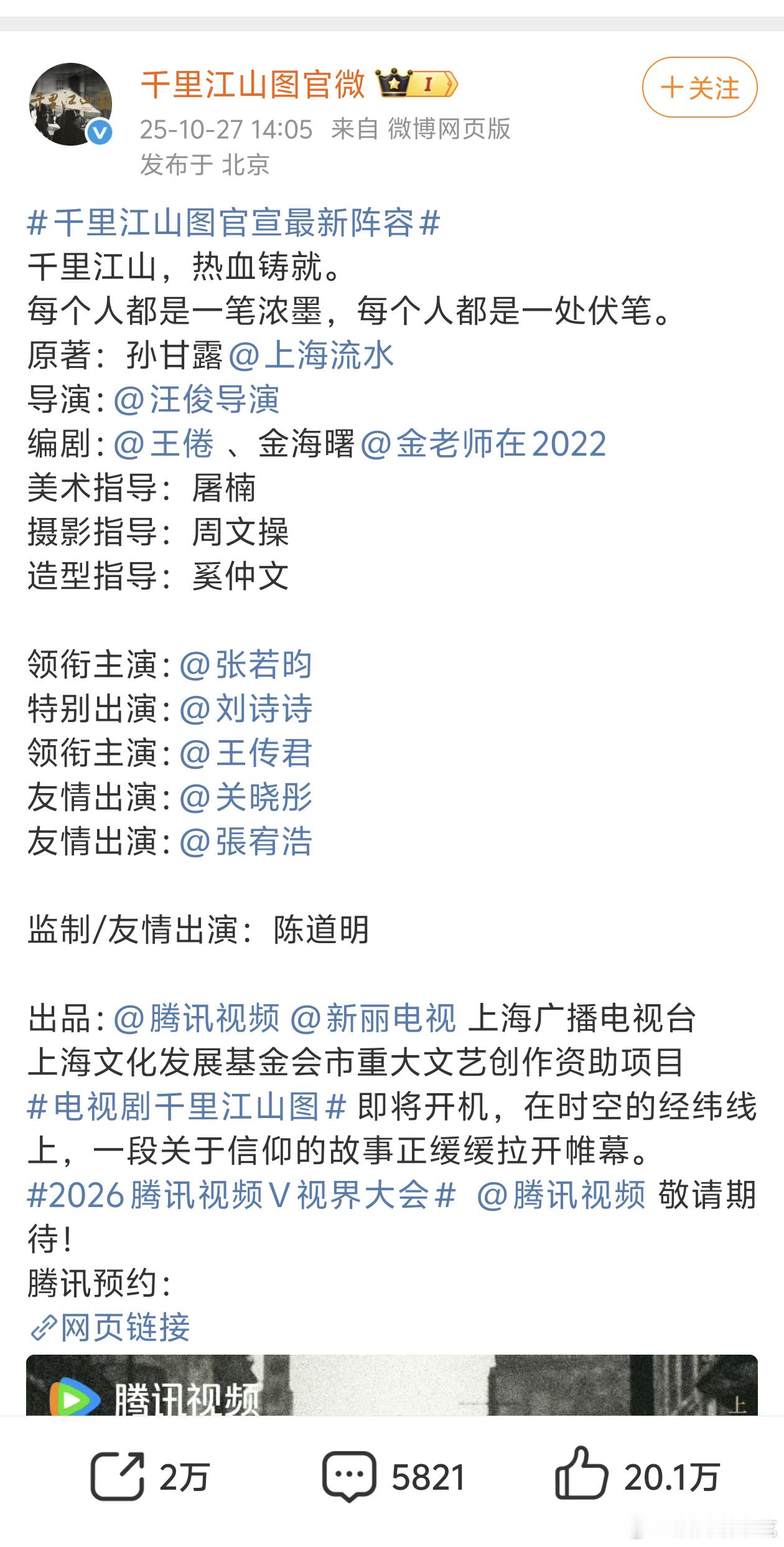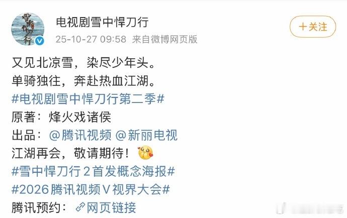 首页开始传雪中悍刀行2的阵容,突然想起新丽官宣启动还没有开机的剧好多↓还有一部将门毒后传的Q1(据说版权要过期了,大概这部最先开吧),千里演员都宣了应该能排在前面吧,不知道第一季度开不开[黑线]赘婿都这么久了感觉要成有生之年系列。