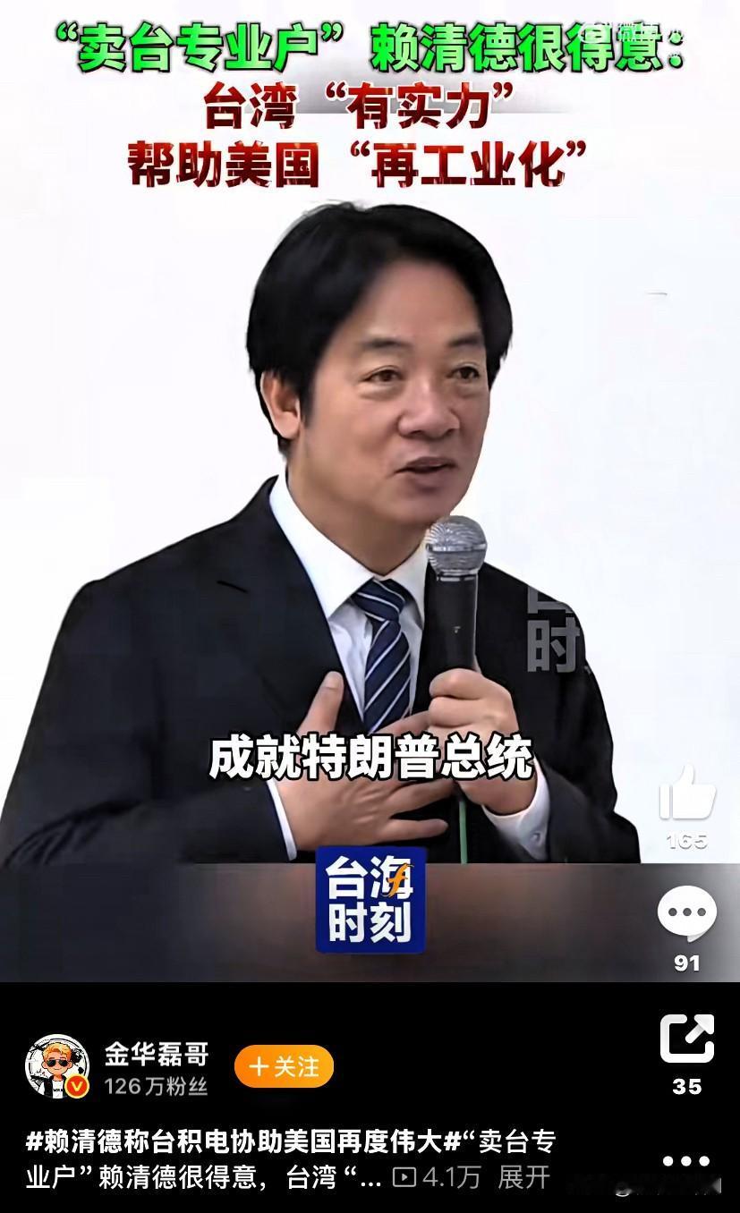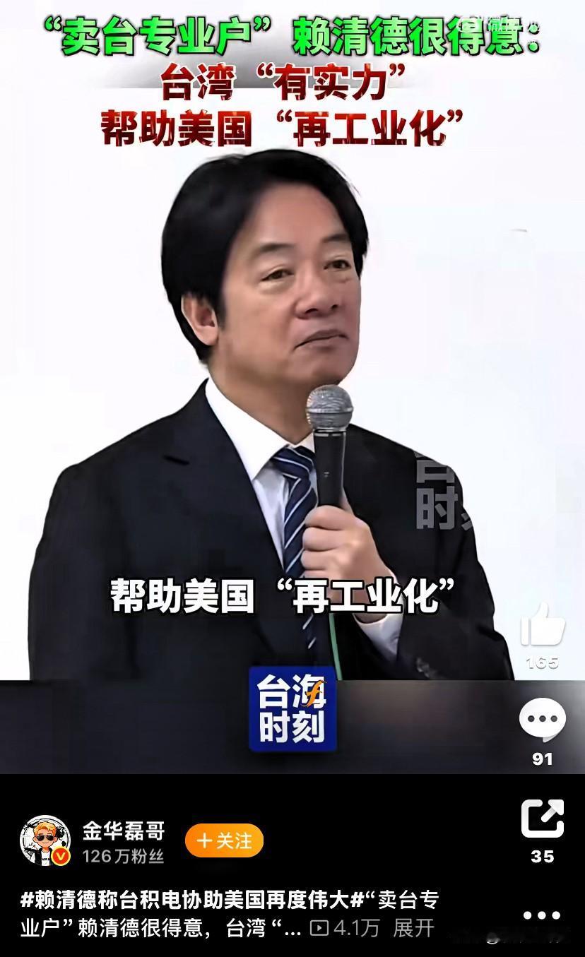 赖清德为谋取一党之私利,依美谋独,拱手把台积电让给美国,还大言不惭地要加大对美投资,成就特朗普,帮助美国再次伟大,难道大洋彼岸美国的强盛与否,比台湾人民的幸福安全更重要? 美防长赫格塞斯说过,“在过去15年,所有和中国有关的兵棋推演,完美说明美国都是败阵”。 美国国防战略负责人柯比尔公开表示:随着中国军事力量的发展,中美之间的军事平衡已经被打破,“台湾已不是美国的生存性利益”、“美国不一定必须防卫台湾”。 这次釜山会议,中美不谈台湾,已经说明问题,台湾是中国固有领土,何时收复台湾,无需和谁商量。 赖清德欺骗民众、卖台求独、数典忘祖,不承认自己是中国人,甚至连祖宗都不承认了,这种人就是现代版的汪精卫。