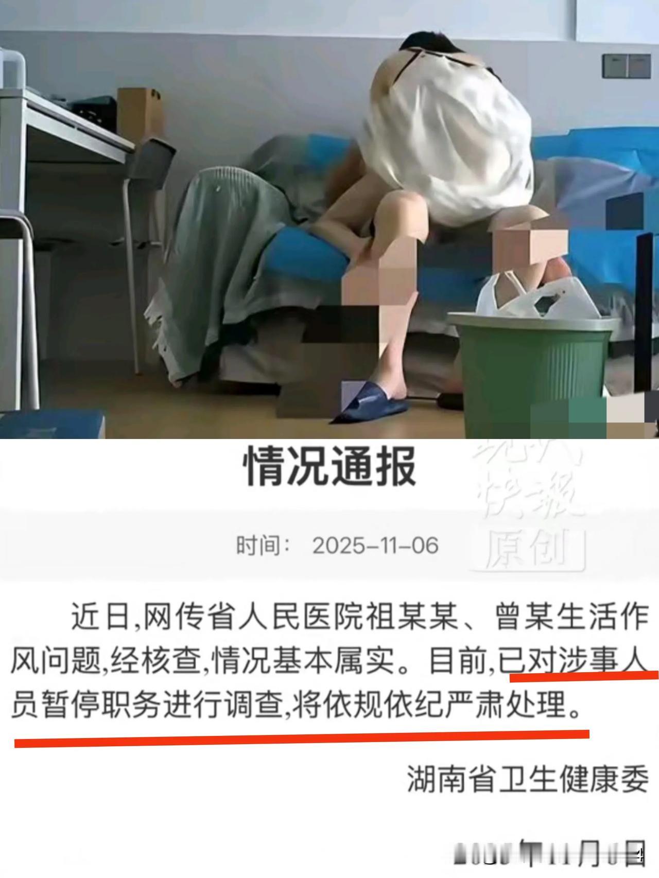 后续来了,出轨视频据说是女医生的老公发出来的,至于是谁发给他的目前还不确定。视频拍摄时间显示为2025年8月18日,但直至10月末才由其老公在网络曝光,这么长的时间间隔,可能中间还发生了不少事情 目前院方回应,纪检已介入调查。卫健委也刚发布通报,经核查,情况基本属实,已对涉事人员暂停职务进行调查 有网友还说,私德问题觉纪委会处理,仕途肯定是没了。后续还要看是否涉及权色交易、腐败等问题 哎,真是太可惜了,事实上,很多网友可能是患者也都表示,能看好病,不为难患者,不收红包,就是好医生!有些你觉得的好人背地里还不知道干过什么呢? 还有网友说,没有利益关系会被发出来吗?既然发出来能决定利益,那就有关系啊 对于此事,发酵几天下来,网友基本态度都很明确,一派觉得无所谓,一派觉得两人毕竟都有家庭,太过分了! 吃瓜吃瓜,还是让子弹飞一会儿吧!蹲一个后续!