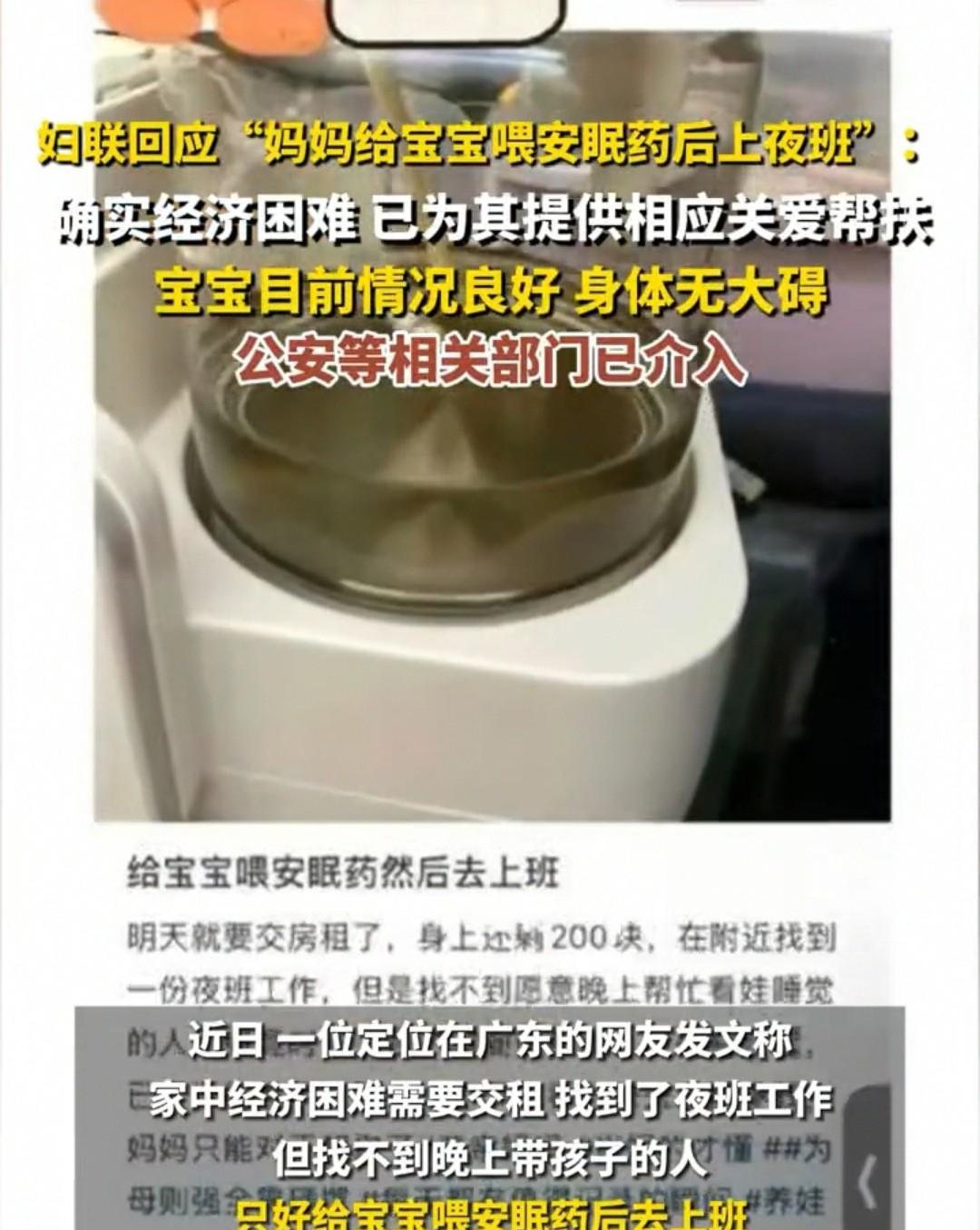 广东,女子找了一份夜班工作,但宝宝没人带,她便想给宝宝喂安眠药。她说,明天就要交房租了,兜里只有200元钱,只能选择对不住宝宝了。网友们看到后,劝她不要这样做。后来妇联也赶紧调查,得知情况属实,并且已经为女子提供了帮助。 女子生活非常拮据,她迫切需要一份工作来改善现有状况。 可是宝宝还小,又找不到人带,她非常苦恼,就想着等宝宝晚上睡觉后自己再去上班,是不是会好一点? 因此,她就抱着宝宝四处找晚班工作,跑遍了每条街道,终于在附近找到了一份夜间工作。 她最初侥幸地想,能不能带着宝宝一起上夜班?但对方表示,实际情况不允许带孩子,这可怎么办呢?真的要把宝宝放在家里吗? 女子一时下不了决心,可看着包里只剩200元的自己,此时也坚决认定,这个班必须上,不然生活永远无法改善。 因此,她做出了最无奈的举动:把宝宝放在家里,但又怕发生意外。万一孩子醒了找她怎么办?万一孩子爬下床摔倒怎么办? 于是,女子就想给宝宝喂点安眠药,让孩子昏睡到自己下班回来。她也知道这样不好,会伤害宝宝的健康,但和生活压力比起来,她觉得这种方式是当下最好、最适合的选择。 为了抒发内心的纠结,她拍了一张自己抱着宝宝的照片,讲述了自己的实际情况,还说为了上夜班,只能对不起宝宝,要靠给孩子喂药才能放心去工作。 网友们刷到后,赶紧劝她不要这样做:首先,就算喂了药,也无法确保宝宝中途不会醒来,到时候可能出现意外; 其次,如果长期这样喂药,对宝宝的身体肯定有害,到时候得不偿失,后悔都来不及,后续花的医药费可能比挣的还多; 更多人则劝她找一个能晚上帮忙带孩子的人,可她表示,夜班时间太长,没人愿意帮忙。 这条路走不通,大家又说,我们捐点钱给你吧,帮你度过这个难关,等找到人帮忙带孩子再去上班。 不过也有人担心女子是作秀,让大家先别着急捐款,先了解清楚情况再说,免得被有心之人利用了善良。 很快,公安、妇联得到消息,赶紧联合找到了该女子,经过实际调查,确认她叙述的情况基本属实,于是立即为她提供了帮助。 不过,对于女子是否已经给孩子喂了药、是否是单亲妈妈等情况,工作人员没有回应,这些属于她的隐私,不便外传。 但可以确定的是,这位女子确实经济困难,确实想去上夜班,也确实找不到人帮忙带孩子。 得知妇联已经在提供帮助,大家也松了一口气。每个人都有一颗怜悯之心,遇到这样可怜、需要帮助的人,总愿意伸出援手。 不过,网友们也希望女子不要用孩子的健康换取收入,一定要找到两全其美的办法。钱没有了可以再挣,但健康没了就再也回不来了。 一、女子为了上夜班,选择给孩子喂药,触犯法律底线 《未成年人保护法》第十七条明确规定,监护人不得实施危害未成年人身心健康的行为。 给婴幼儿喂安眠药可能损伤肝肾、影响神经系统发育,即便出于无奈,也已触碰法律底线,若实施可能面临治安处罚,情节严重的还可能涉及故意伤害罪。 同时,该法第二十一条要求,不得让未满八周岁的未成年人处于无人看护状态,这既明确了母亲单独留娃的风险,也为相关部门介入提供了法律依据。 二、女子遇到困难,可以申请救助 依据《社会救助暂行办法》,对经济困难家庭应简化临时救助申请流程,让女子这类仅剩200元、面临房租压力的家庭,能快速获得经济支持,无需铤而走险。 另外,应该扩大夜班托育服务供给,对困境家庭给予托育补贴,从根源上解决“无人带娃”的难题。 对于此事,大家如何看? 素材来源于:九派新闻2025年11月6日