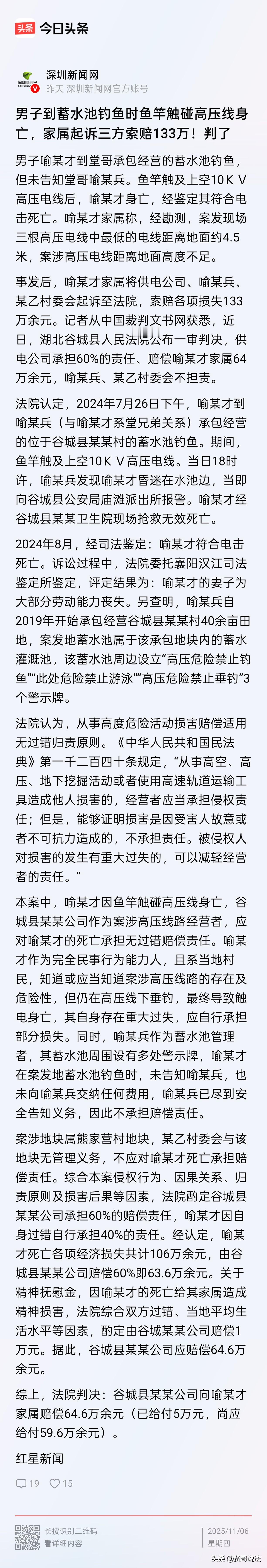 湖北襄阳发生一起具有警示意义的事件,一男子来到堂哥家承包的鱼塘钓鱼时,因操作不当,让鱼竿碰到了高压线,最终被电击身亡。男子的家属随后将供电公司、堂哥及村委会告上法院索赔133万余元,法院这样判了。(信源:深圳新闻网) 喻先生和喻某是五服内的堂兄弟,2024年7月26日这天,喻某来到喻先生承包的鱼塘钓鱼。 喻某在钓鱼过程中,因其坐在高压电线正下方,一个没注意,鱼竿碰到了高压线,喻某当场触电昏迷。 直到下午6点,喻先生才在鱼塘边发现喻某,便赶紧拨打急救电话并报警。 然而,喻某最终还是因抢救无效死亡。 经调查,涉事鱼塘边立有“高压危险禁止钓鱼”等警示牌。三根高压线最低处距离地面约为4.5米。 事情发生后,喻某的家属将喻先生、供电公司及村委会一同告上法院要求赔偿各项损失共计133万余元。 那么,喻先生、供电公司及村委会又是否要对喻某的死亡结果负责呢? 本案是一起典型的触电人身损害责任纠纷,争议焦点关键在于本案的责任承担问题。 1、法院经审理后认定,供电公司需承担60%的责任,即要向喻言家属赔偿636000余元。 这又是为何呢? 《民法典》第1240条规定,“从事高空、高压、地下挖掘活动或者使用高速轨道运输工具造成他人损害的,经营者应当承担侵权责任; 但是,能够证明损害是因受害人故意或者不可抗力造成的,不承担责任。被侵权人对损害的发生有重大过失的,可以减轻经营者的责任。” 在这里,我们要关注一个概念,即“无过错责任”。 简单通俗点讲就是,哪怕你没做错事、没犯错,只要你的行为造成了别人的损失,法律规定你就得赔钱。 即本案就适用于这款“无过错责任原则”的规定。 喻某因鱼竿触碰高压电线致死,除非供电公司能证明喻某是故意的或不可抗力(天灾),否则,无论怎样,它都要担责。 2、喻先生不承担责任。 事发当时,喻先生并不知道喻某来鱼塘钓鱼,喻某也未曾支付过任何费用。 且喻先生在周围设置的“禁钓”标识表明其已尽到了告知义务。 喻先生对喻某的电亡不存在过错,因而无需担责。 3、村委会同样不承担责任。 涉案鱼塘系属他村地块,村委会不具有管理义务,不应对喻某死亡结果负责。 4、喻某本人需承担40%的责任。 喻某作为一名具有完全民事行为能力的成年人,应当意识到在高压电线下钓鱼的危险性。 基于此,他仍然而为之,对自身被电亡的结果存在重大过失,需自行承担相应的责任。依法可以减轻供电公司的责任。 钓鱼原本是一件修身养性的趣事,深受不同年龄段的喜爱。但在此过程中也同样存在着一些不可小觑的风险,每每祸事发生,实在让人痛心 总之,喻某的遭遇也再次提醒广大钓鱼爱好者而言,一定要系牢“安全第一”这根绳,切勿在高压电线下垂钓! 毕竟,没有什么东西能比生命重要。 对此,你怎么看呢?欢迎大家在评论区留言。(注:图片仅供示意)
