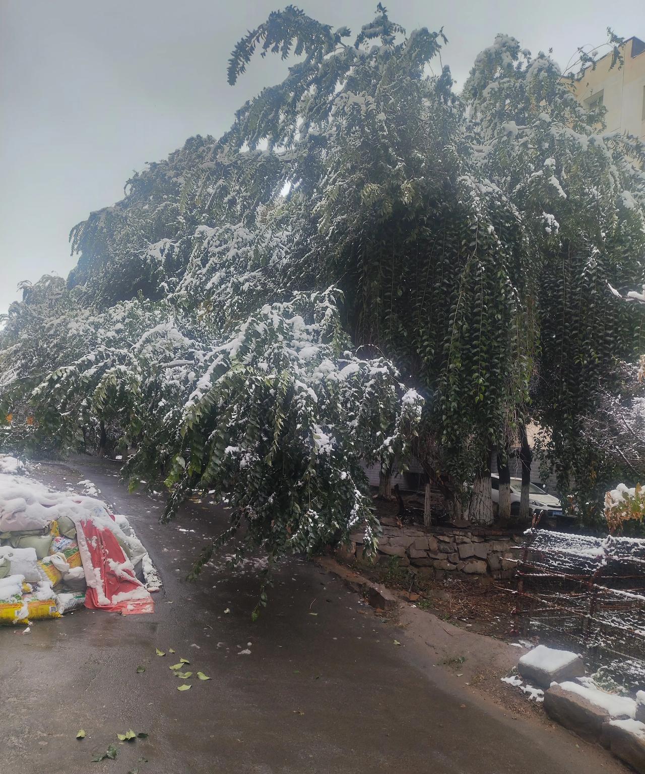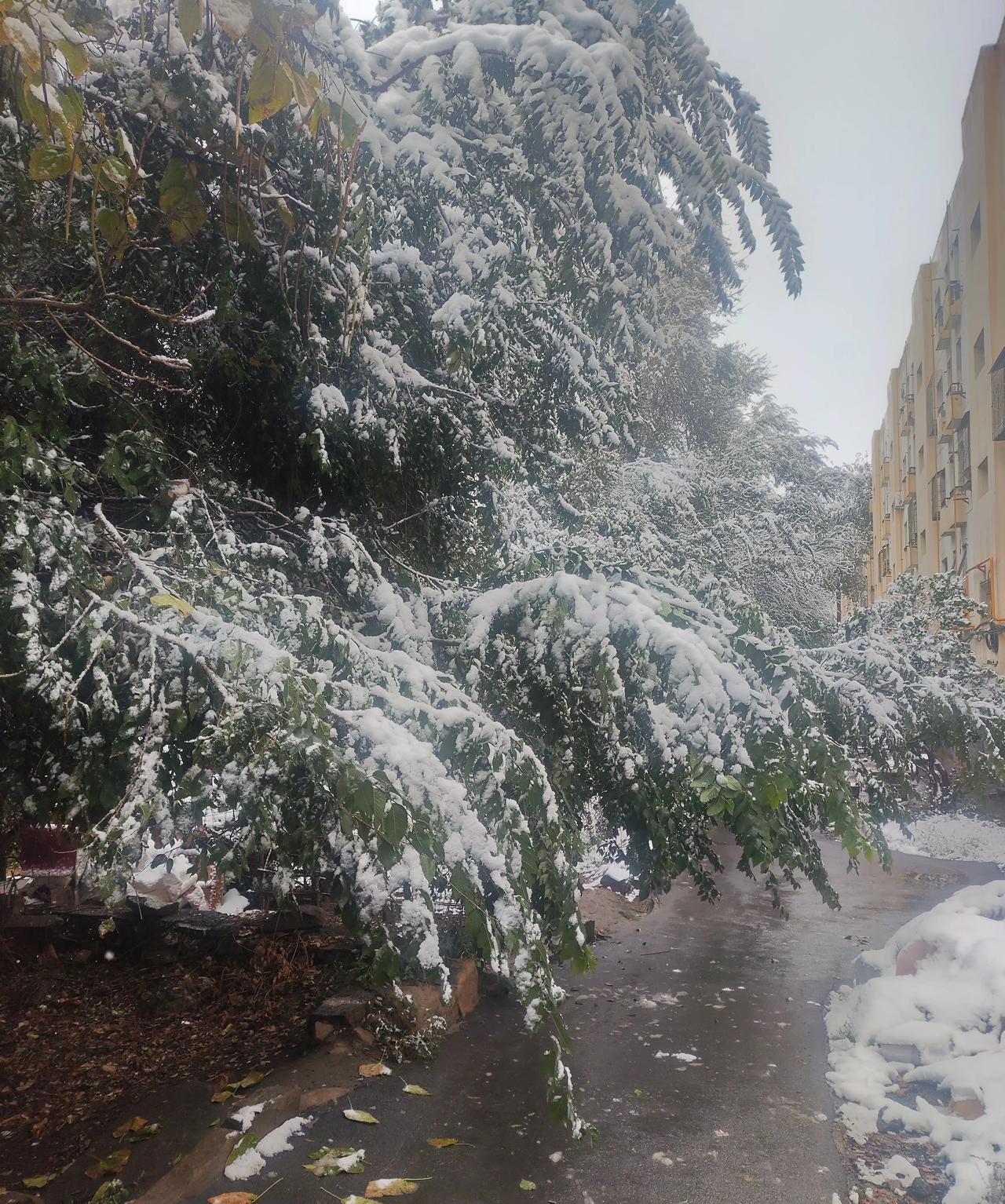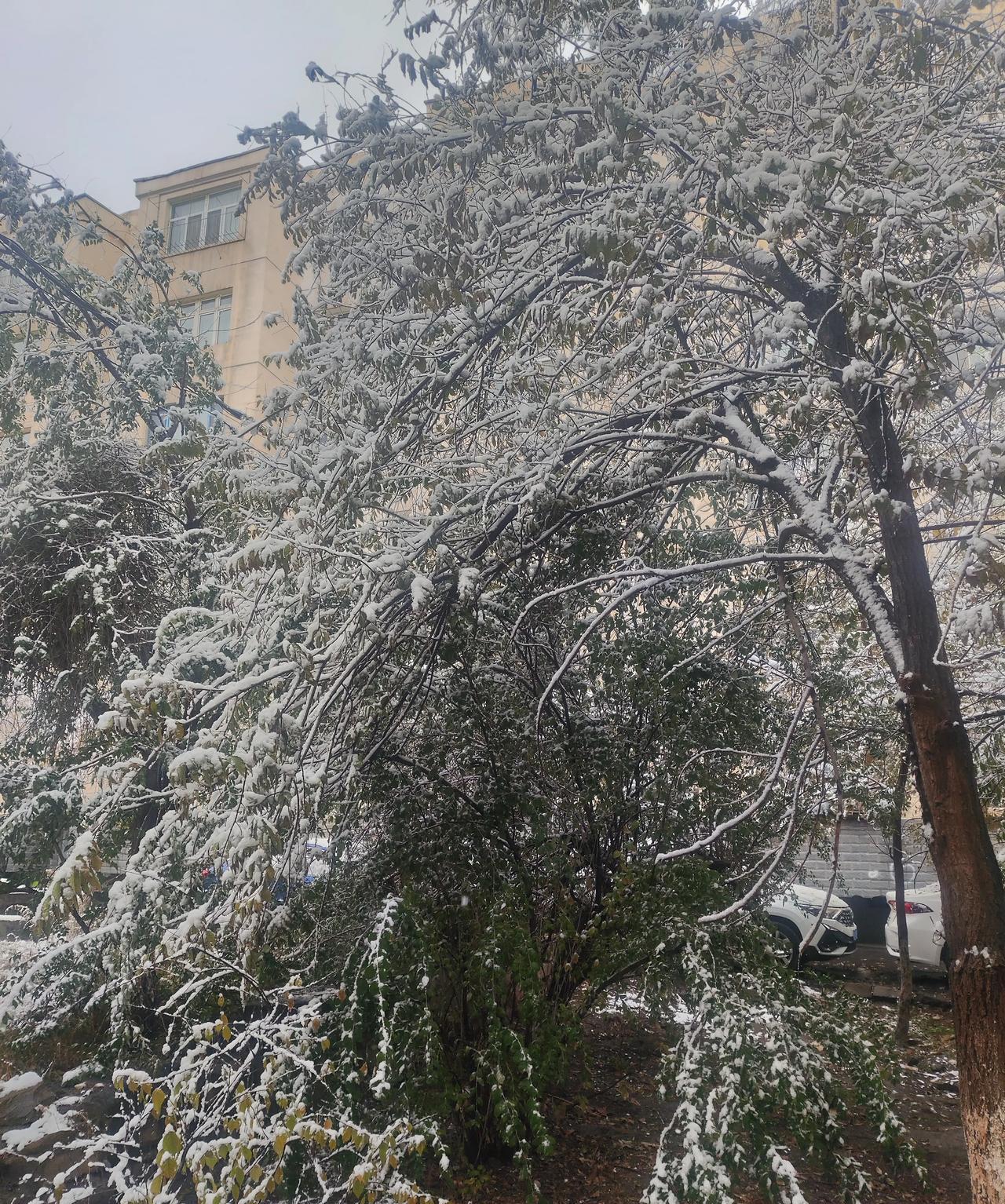 乌鲁木齐市经过大雪洗礼后的景色有些浪漫 昨晚到今天下午乌鲁木齐市下了近22个小时的雪,因为2025年的第二场雪比以往时候来的更早一些,让许多还有绿叶的树木不堪重付纷纷低下了高贵的头颅。 只是不知大雪压断的树枝砸坏了车辆保险给赔偿吗?真是损失大了呀!