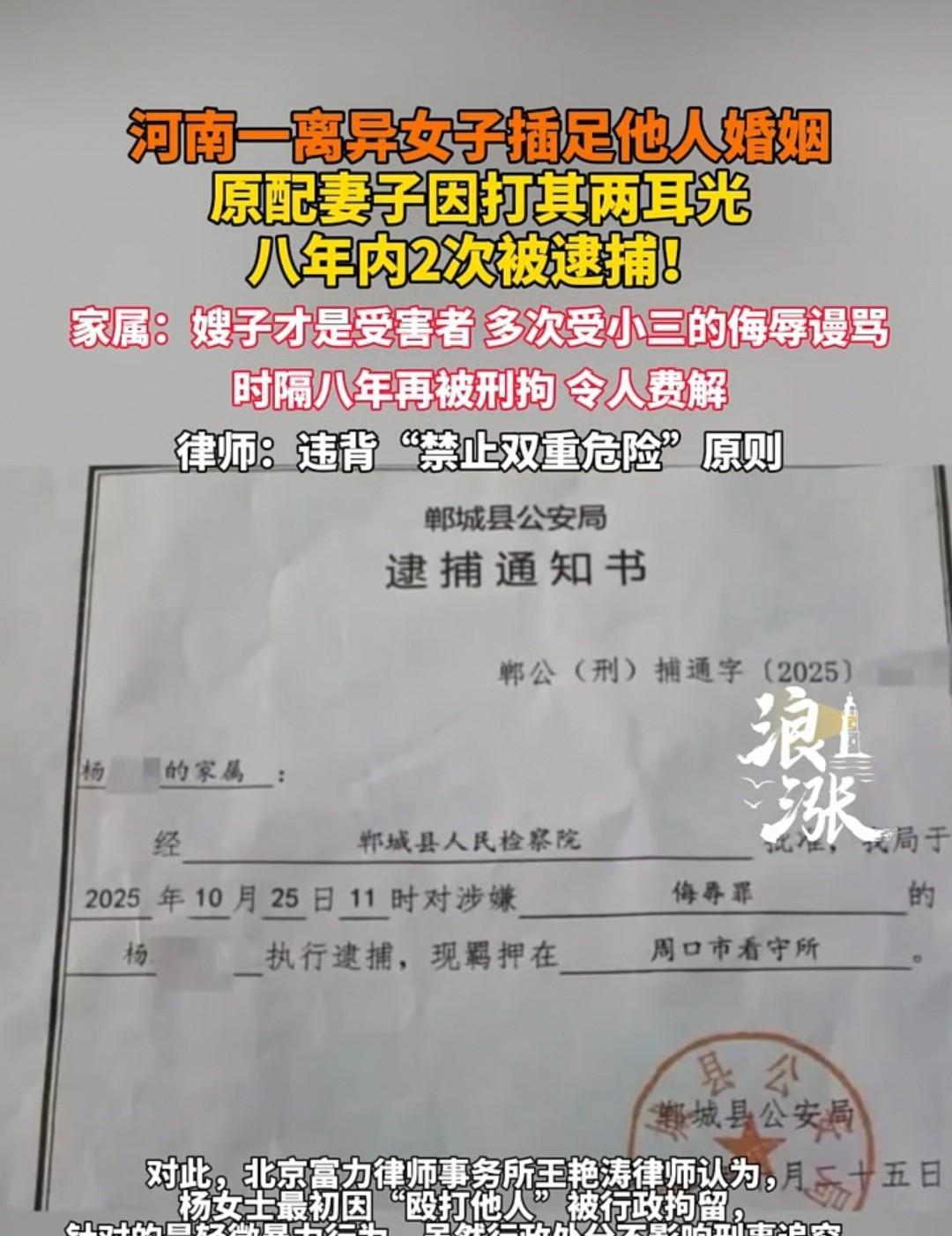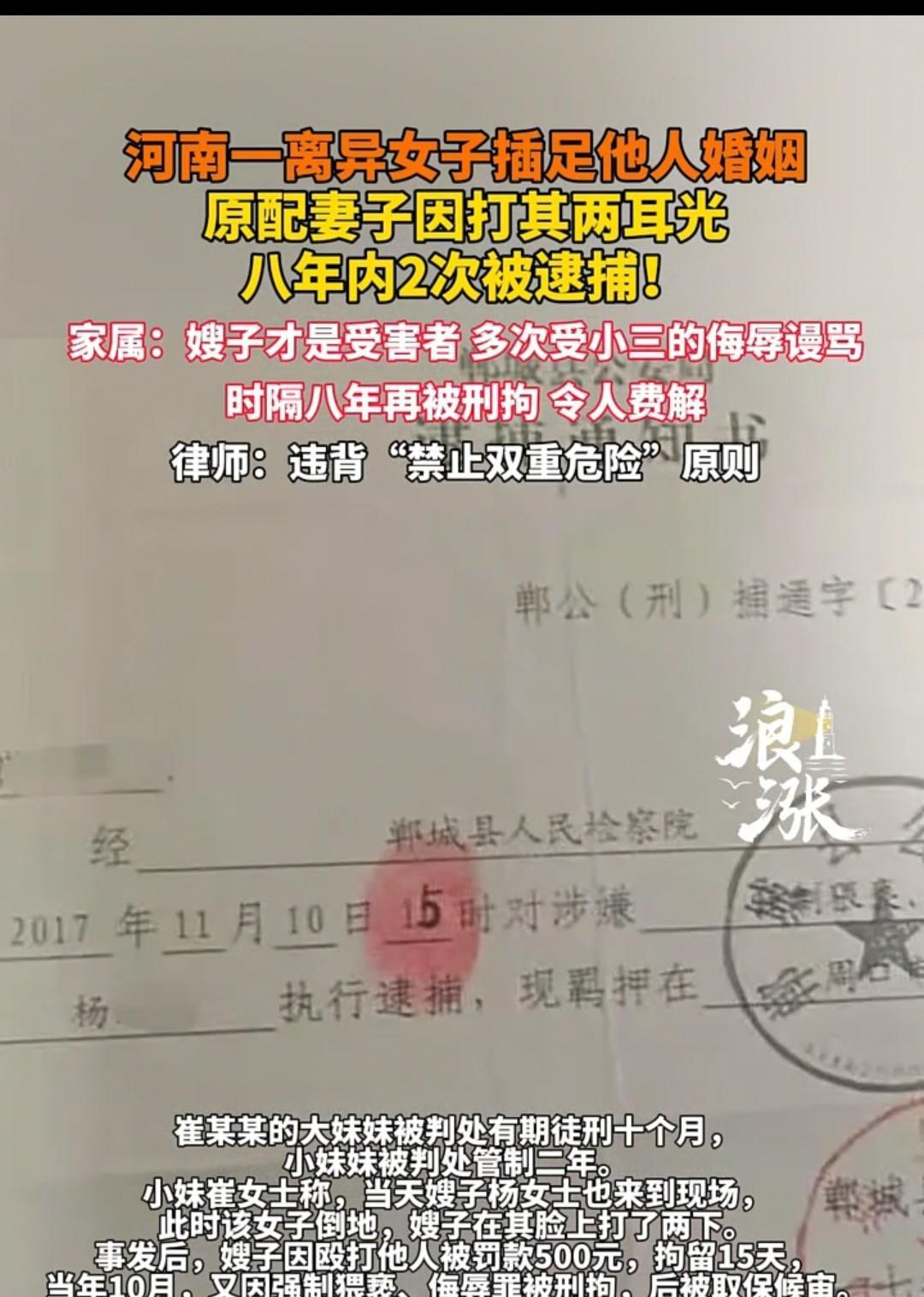 河南,女子打了丈夫婚外交往的对象两下,被行政拘留15天、罚款500元。八年后,该女子又因当时的那件事,以侮辱罪被刑拘。本该遵循“一事不再罚”的原则,却出现了再次追责的情况,引发了网友们的热议。 在2016年,崔某认识了一位离异女子,对方那叫一个风情万种,把崔某迷得不知所措,最后发生了关系。 事后,崔某也很后悔,他并没有想过和妻子离婚,也没有想过和该女子结婚。 但是崔某的工作单位挺好的,工资待遇也不错,这位女子就纠缠着不放,硬要和他在一起。 最后,她还以自己怀孕了,闹到了崔某的单位,最后,经过调解,崔某赔偿了该女子9万。 本以为这个事情就结束了,可是,在2017年6月3日,该女子又找到崔某的妻子杨女士,两人一见面,分外眼红,又争论了起来。 这时,崔某的两个妹妹也赶来支援杨女士,因为在她们心目当中,特别恨该女子破坏自己哥哥的家庭,她们是百分之一百站在杨女士这一边。 结果两位妹妹动作过大,把该女子下身的衣服都给扯掉了,当时杨女士也非常生气,“我不找你,你居然又来找事,谁遇到了不发泄一下呢?”因此就上去在该女子的脸上打了两下。 就因为这两下,杨女士被拘留了15天,还被罚款了500元。 而崔某的大妹妹也被判了十个月有期徒刑,小妹妹被判管制两年。 这让崔某痛不欲生,当初自己的错误,却要让自己的妻子和妹妹来买单。 可该女子这还没有完,觉得她们三人在大庭广众之下扯掉了自己的衣服,是极其侮辱人的行为, 因此,要求以强制猥亵、侮辱罪追究她们的刑事责任,不过后来都被取保候审了。 现在姑嫂三人想想都后怕,怎么遇到了这样的人?对方是上门来挑衅她们的,居然最后受罚的还是自己,这谁能想得通啊? 三人觉得,只怪当时大家的情绪太激动,不小心把衣服给扯掉了,还扇了两下。 不过谁遇到这样的事情,不发泄一番呢?自己哥哥好端端的一家人,被她扰乱成这样,崔某工作单位那么好,被她这么一扰乱,影响前途,怎么想都觉得当时做的没有错。 大家以为这件事终于翻篇了,可是到2025年9月28日,杨女士又因侮辱罪被刑拘,在2025年10月25日,正式下达逮捕令。 她们怎么也想不通,当时在该女子脸上打了两下,妹妹不小心把下身的衣服扯掉了,该判刑的判刑了,该拘留的拘留,该罚款的罚款,怎么这个事情就没完没了呢?怎么时隔八年还要被刑拘? 网友们也看不懂呀! 之前姑嫂都被处罚了,虽然在同年10月,该女子不服气,觉得判罚太轻,才又以强制猥亵、侮辱罪刑拘了她们,不过都取保候审了,本应该了结了呀。 怎么这时隔八年又来一招? 法律人士也表示,“一事不再罚”,之前已经处罚过了,就不应该再处罚,此次适用的条款显然是有错误的。 不过直到现在,相关部门还没有给出具体的说明。 一、“一事不再罚”原则的适用争议 该原则禁止对同一违法行为重复给予同类处罚,但不排除行政责任与刑事责任的衔接——若违法行为已达刑事标准,可在行政处罚后追究刑责。 但本案中,杨女士2017年打耳光的行为已被行政拘留,崔某的大妹妹被判处有期徒刑十个月,小妹妹被判处管制两年,二人已被依法追究刑事责任,三人的行为均已接受过完整的法律评价。 2025年时隔8年,再以同一行为对杨女士及崔某妹妹重启“侮辱罪”追责,违背核心逻辑:同一行为的社会危害性未发生变化,重复追责既突破了“禁止双重危险”的司法精神,也违反“一事不再罚”原则,程序上存在明显瑕疵。 二、罪名定性的界限与合理性 本案中崔某妹妹的行为曾涉及“强制猥亵、侮辱罪”与“侮辱罪”,二者差异显著:前者侵犯性自主权,需具备性意味的强制行为;后者侵犯人格尊严,表现为公然贬低他人名誉。 妹妹撕扯对方下身衣物的行为,虽具有公然侮辱属性,但已在2017年以“侮辱罪”作出刑事判决(大妹有期徒刑十个月、小妹管制两年),且无证据显示该行为具有性侵犯意图,不构成“强制猥亵、侮辱罪”。 如今再以同一行为重复追究“侮辱罪”,不仅定性无新意,且未达到“新情节、新危害”的重启追责标准,缺乏实质依据。 三、处罚时效与程序正义的双重考量 侮辱罪的追诉时效通常为5年,崔某妹妹的行为已被定罪且过追诉时效,杨女士的行为同样时隔8年,均未出现新证据或法定事由,此时重启追责违背追诉时效制度“稳定社会关系、避免无限期追责”的立法初衷。 法律人士指出,行政机关与司法机关的处罚需遵循“一事不再罚”的程序约束,姑嫂三人的行为早已通过行政处罚、刑事判决(崔某妹妹)全面评价,且处罚力度与行为危害性相匹配,不应重复启动刑事程序。 对于此事,大家如何看待? 素材来源于:新黄海2025年11月6日报道