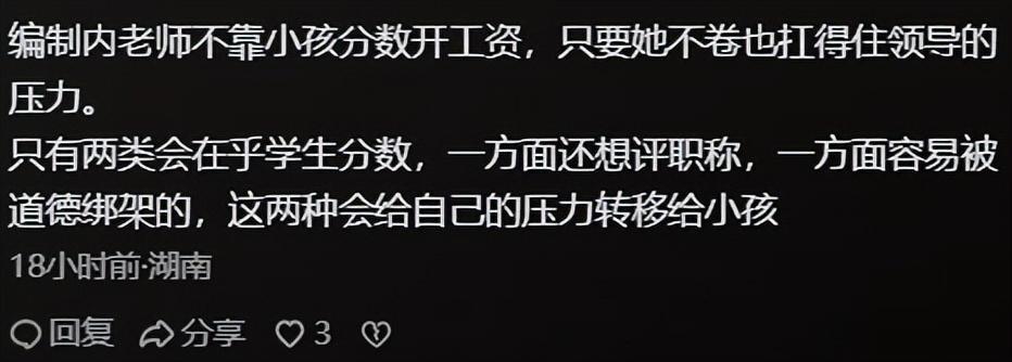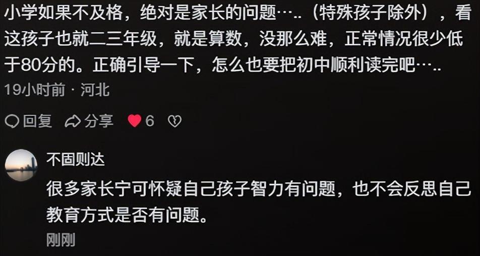 如此父母,智慧?躺平?还是摆烂? 刷到一段小学生与父母的对话(不确定是否为剧本)。 内容大体如下: 孩子:老师不让我参加期中考试,说拖班级分。 父:很正常,你影响老师绩效,影响老师收入了。咱又不上补习班,学习跟不上,很正常。 孩子:考试很差,几十分,老师说下次再考差,要挨揍。下午不想上学了。 父:很正常。你影响老师收入,影响老师生活。那咱下午就不去了? 这个视频的评论区挺热闹的。 梳理了几个观点: 1 孩子大概撒谎了,编排老师,因为老师的收入(绩效)不受孩子成绩影响; 2 孩子成绩差,是父母责任(摆烂),因为不上心,一句“很正常”,暴露心态; 3 家长很开明,没有给孩子太大压力(不内卷,躺平); 4 老师这个做法不对,家长应该为孩子争取权益,而不是支持,逃避; 5 学生成绩不直接影响老师收入,但会影响老师的发展(晋升、评职称、岗位调动),也可能是老师的额外收入(补课,销售教辅等); 6 家长想开明式的教育孩子,但是理解的又不够,搞成了邯郸学步,东施效颦; 如果是你的孩子,说:老师因为我成绩差,不让参加期中考,你会怎么处理这个问题? 就我而言,这个父亲的处理,可以梳理一些可取,一些值得思考的地方: 第一 把老师当做有血有肉的人,而不是过于美化(大道理、鸡汤),身为老师应该怎么样怎么样,而是老师也要生活,老师也有进取心(KPI,晋升,考评。。);这样的逻辑跟孩子沟通,孩子能很早的就理解人性,正视人性,以后其实可以少走很多弯路——不用被伤害以后,才正视人性。 第二 在没有好的方式适合处理,淡化冲突:儿子不能参加期中考失落,但是儿子也不愿意参加补习班,那就冷处理——你不愿意参加补习班,就像老师不愿意你参加期中考一样合理:各自有各自的诉求,彼此尊重。 第三 冷处理(淡化矛盾,冲突)以后,如何解决这个问题? 在可能和事实之间存续一个演变的过程。——《天道》 如何演变? 正如网友评论的:小学如果不及格(特殊情况除外),绝对是家长的问题。 不是不会不及格,而是不及格意味着有问题,问题如何治本?关键在家长。 家长如何帮孩子解决学习上的难点? 能解决,说明家长即了解一定教育原理,方法,也对自己孩子比较了解; 不能解决,就是家长教育上“病急乱投医”了。 男生相对女生来说,“开悟”晚一些(服从性弱一些),如何让男孩子(低年级)意识学习重要性,是一门学问。 而不是讲大道理灌输,这位家长前面铺垫不错,关键就是后续:如何激发孩子的自驱力(愿意多琢磨学习)。成绩差的孩子很笨嘛?成绩差不要考试