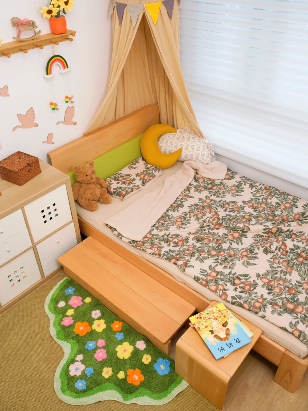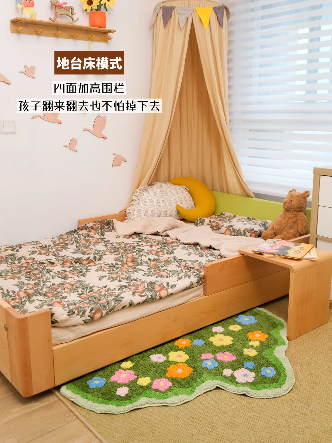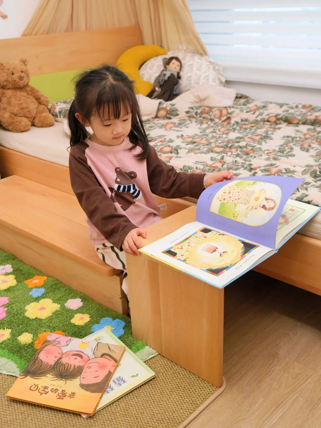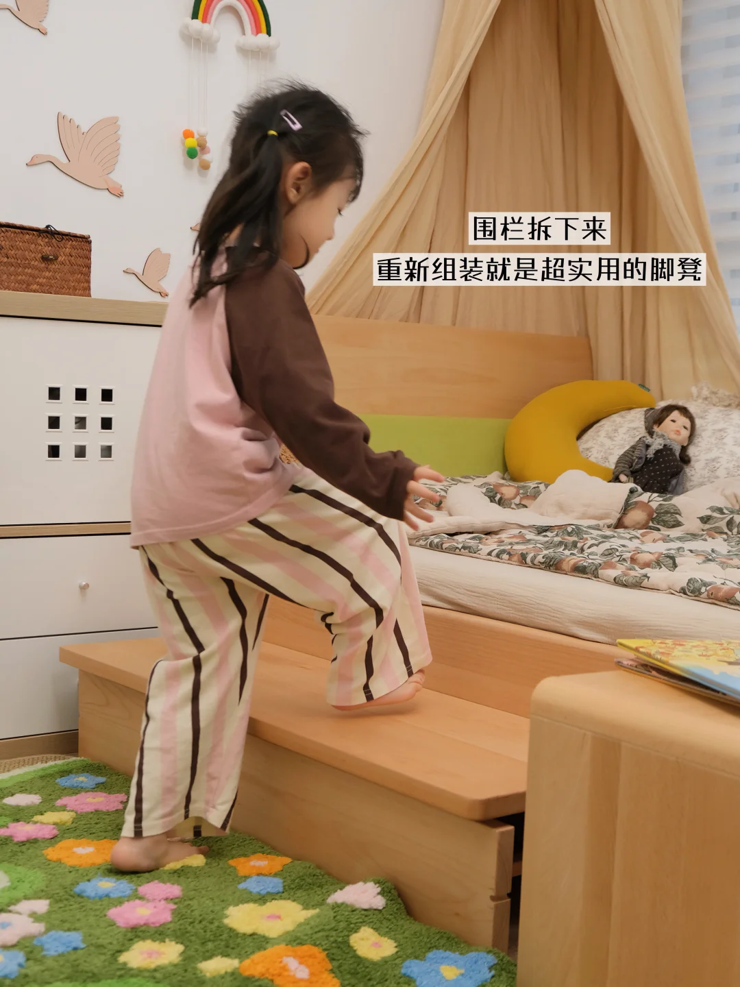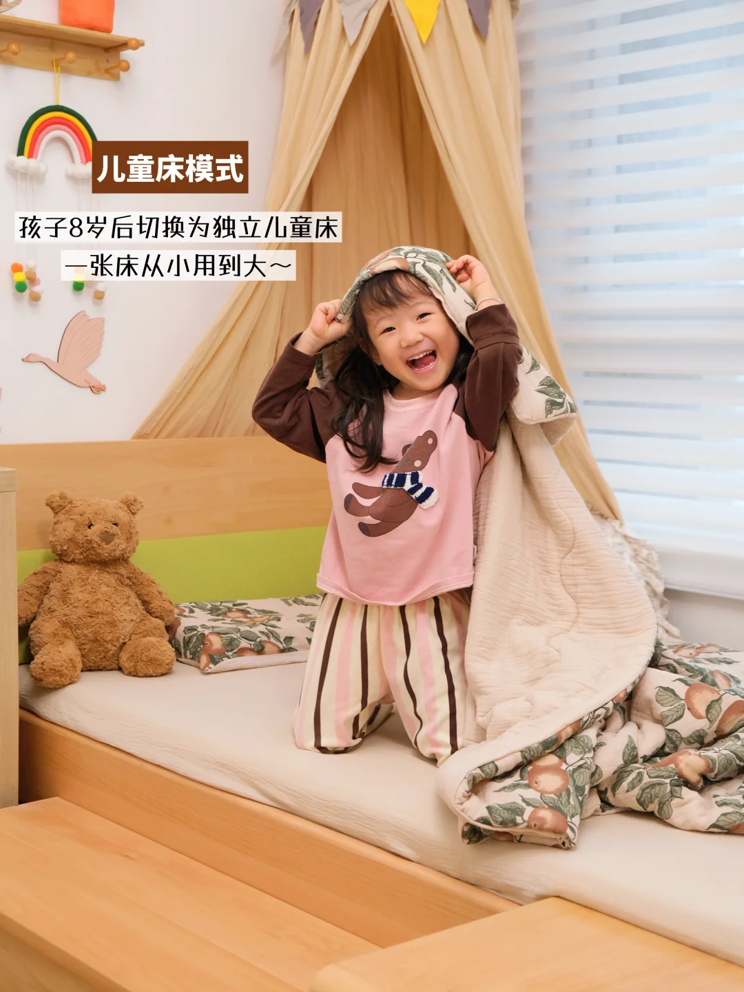 等孩子长大了,就可以把它切换成儿童床模式!拆下来的护栏拼一拼就是两把小凳子,摆在床边当“阅读角”,孩子读绘本、玩玩具或者当个小边几,都很ok!床头高度也能调,陪着孩子一起“长大”~