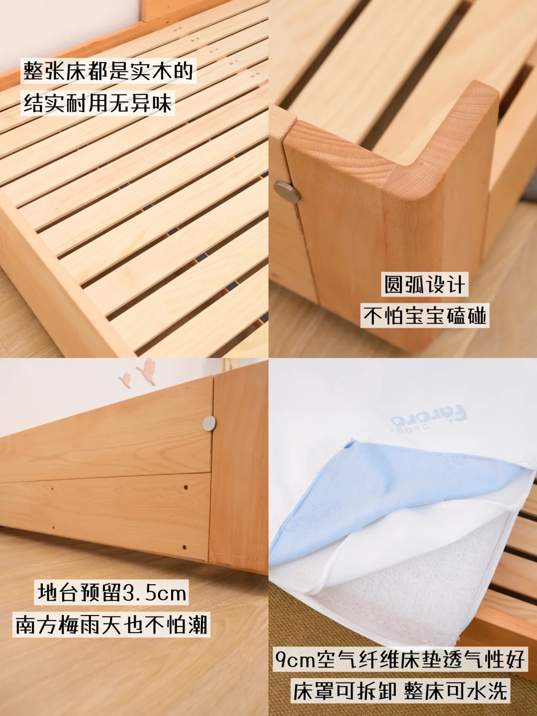 床面距地面只有35cm,还贴心的设计了四面围拦,不用担心孩子翻来覆去会掉下床,孩子上下床也会更方便!床底还贴心的留了3.5cm的透气缝,南方梅雨季也不怕潮!