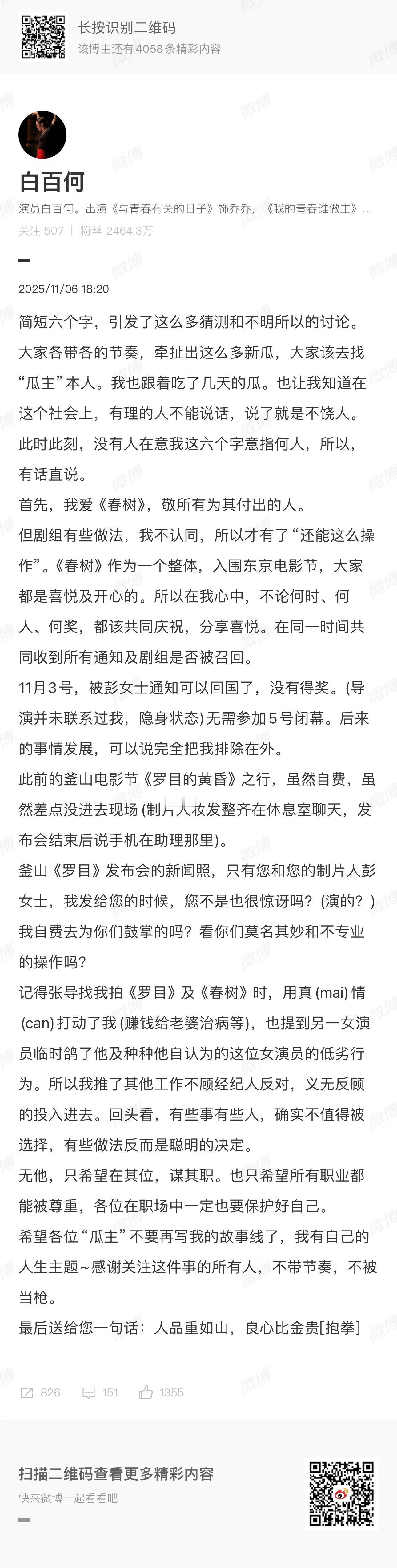 白百何回应白百何[超话] 白百何发长文回应之前的6字争议:简短六个字,引发了这么多猜测和不明所以的讨论。大家各带各的节奏,牵扯出这么多新瓜,大家该去找“瓜主”本人。我也跟着吃了几天的瓜。也让我知道在这个社会上,有理的人不能说话,说了就是不饶人。此时此刻,没有人在意我这六个字意指何人,所以,有话直说。