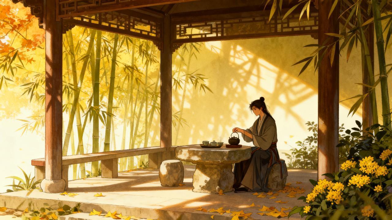 金叶铺街意韵长,单车倚店带花香,小亭一角秋光里,闲坐烹茶话短长,风摇竹影添清趣,岁月安然醉晚阳。 这首诗以秋日街头为背景,勾勒出一幅宁静温馨、充满生活气息的画面,藏着对平淡岁月的珍视与安然。 前两句“金叶铺街意韵长,单车倚店带花香”,先铺展秋日景致:金黄的落叶铺满街巷,意境悠长;一辆单车斜倚在店铺旁,裹挟着淡淡的花香,既写出了秋的静谧,又暗藏生活的暖意,没有喧嚣,只有岁月的从容。 中间两句“小亭一角秋光里,闲坐烹茶话短长”,镜头聚焦到街角小亭,秋光漫洒中,有人闲坐亭下,煮茶闲谈,家长里短的絮语融入秋景,让画面有了人情温度,凸显出生活的闲适与惬意,藏着对烟火气的眷恋。 最后两句“风摇竹影添清趣,岁月安然醉晚阳”,以动态景物收尾:清风摇曳竹影,为景致增添清雅意趣;夕阳西下,人沉醉在这安然的岁月里,升华了全诗的情感——不追慕轰轰烈烈,只偏爱这份平淡中的安稳与美好,传递出对简单生活的满足与热爱。风吹绿树翠 秋日诗句 秋日论诗 秋日唯美古诗句 秋日喝茶诗