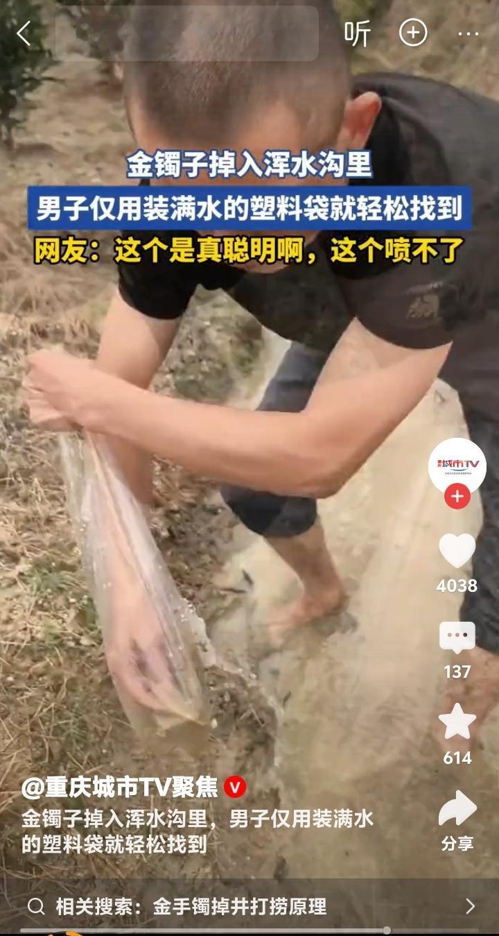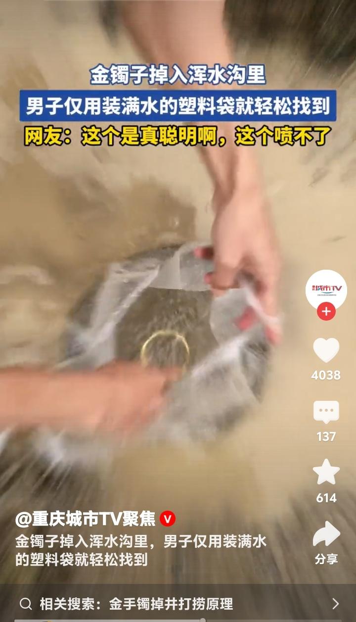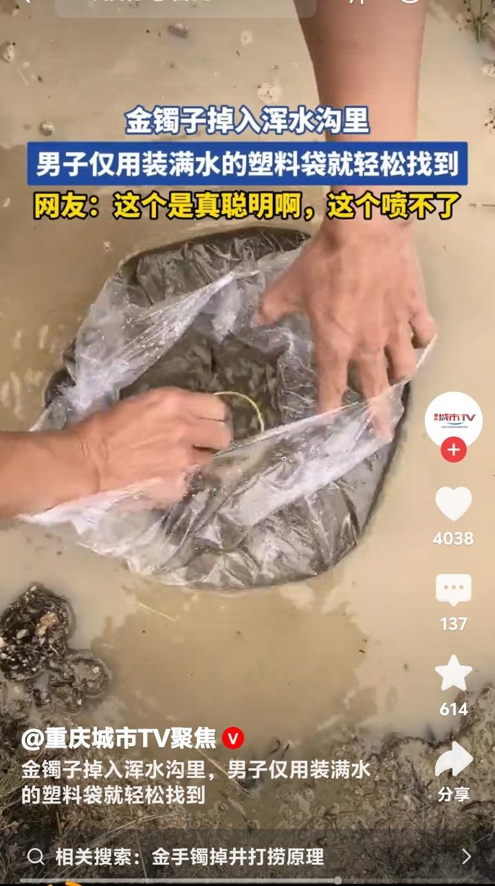 福建街头惊现民间智慧王!金镯子坠入浑水沟瞬间消失,男子一个塑料袋装满水轻松破解困局引爆全网赞叹 (来源:重庆城市TV聚焦) 当那只金镯子“噗通”一声坠入浑水沟时,围观众人的心都沉了下去。浑浊的泥水翻滚着吞没了金光,仿佛在嘲笑人类的无力。失主焦急地扒着沟沿张望,却只看见黑黢黢的水面映出自己苍白的脸。这个看似无解的困局,竟被一位普通男子用装满水的塑料袋轻松破解。 只见他不慌不忙地取出透明塑料袋,在沟渠旁的水龙头下接满清水。当这个鼓胀的水袋被缓缓沉入浑水时,奇迹发生了——塑料袋瞬间变成了天然放大镜,浑浊的水流在透明水袋的阻隔下变得清澈见底,那道金光在泥泞中熠熠生辉。 这看似简单的操作背后,藏着光学的精妙原理。水的折射率让视觉穿透浑浊介质,如同为眼睛装上了“透视镜”。这种来自生活经验的智慧,比任何高科技仪器都更接地气。围观群众从最初的怀疑到惊叹,不过短短三分钟。 视频在网络上引爆的不仅是赞叹,更是对民间智慧的集体致敬。有网友直言:“这才是知识改变生活的完美示范!”当很多人沉迷于昂贵设备时,真正的智慧往往就藏在身边最普通的物件里。 在快节奏的现代社会中,我们习惯了用复杂方案解决简单问题。而这个装满水的塑料袋,像一记清脆的耳光打醒了被科技麻痹的神经。它提醒我们:解决问题的钥匙,可能就挂在厨房的挂钩上。 更令人动容的是男子完成救援后的淡然一笑。他没有索要报酬,只是轻轻甩掉手上的水珠,仿佛刚才只是完成了一次日常劳作。这种不动声色的善良,与急功近利的社会风气形成鲜明对比。 从评论区汹涌的点赞潮中,我们看到了大众对实用智慧的渴望。当书本知识与生活经验完美融合,产生的能量足以照亮整个互联网。有家长留言要带着孩子重做实验,有教师决定将此法写进教案。 这只失而复得的金镯子,照见的不仅是浑浊沟渠下的金光,更是普通人身上闪耀的智慧光芒。它告诉我们:真正的聪明,从来不是高高在上的理论,而是让生活变得更好的能力。