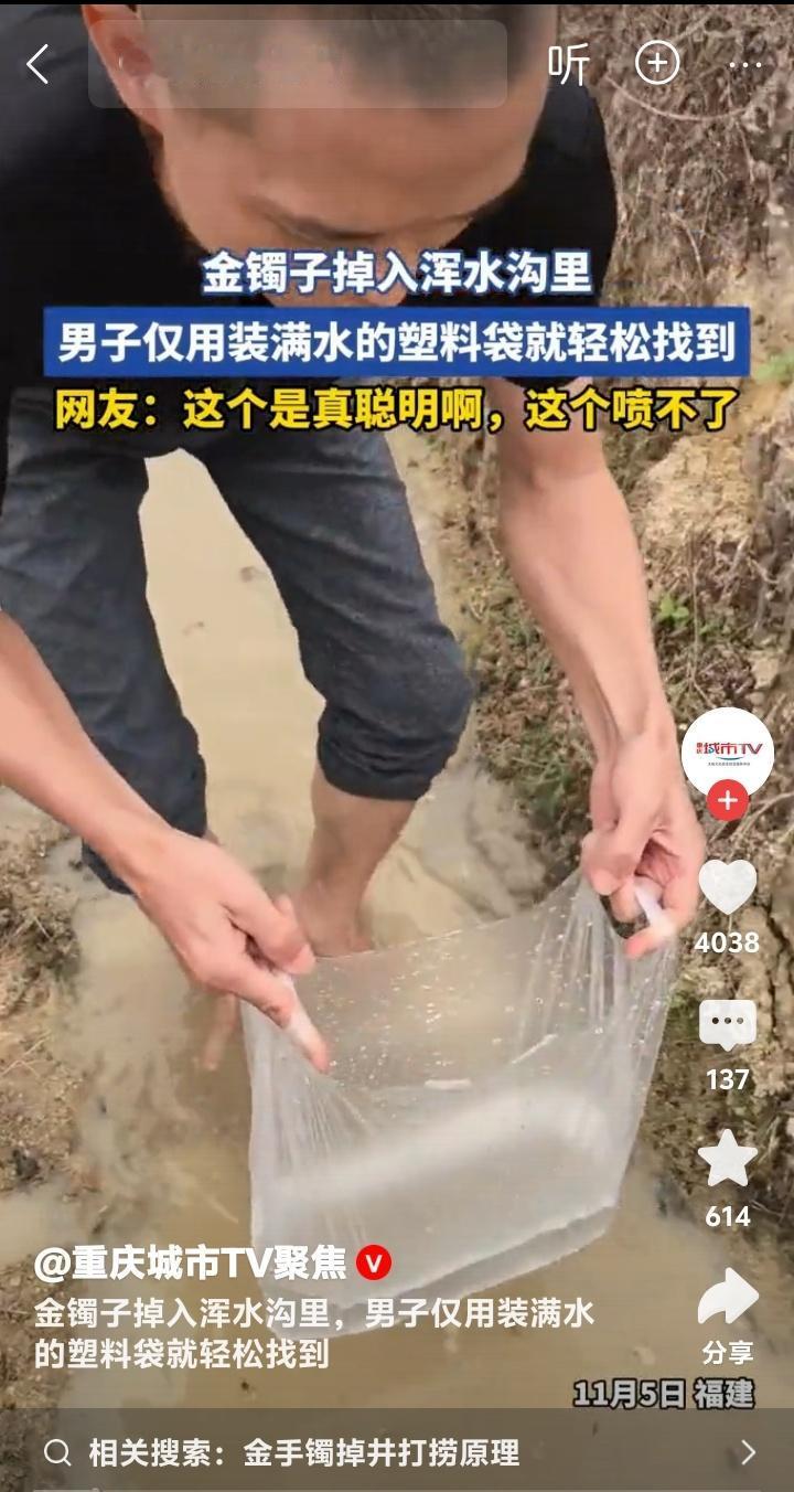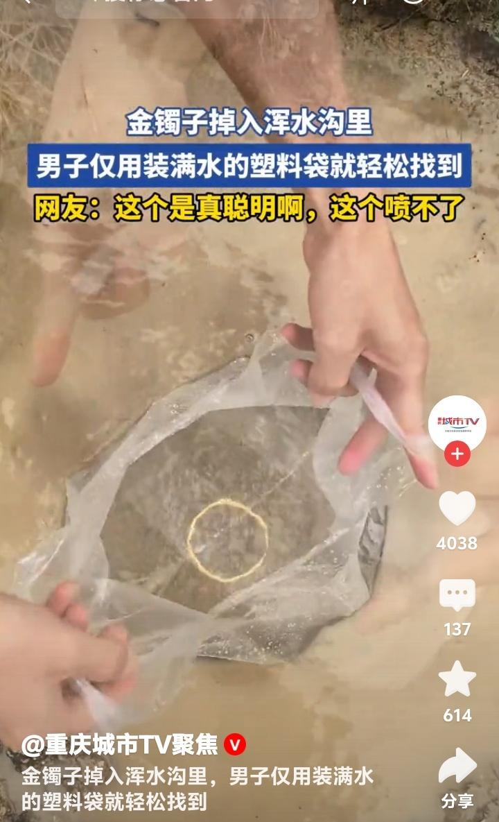 福建街头惊现民间智慧王!金镯子坠入浑水沟瞬间消失,男子一个塑料袋装满水轻松破解困