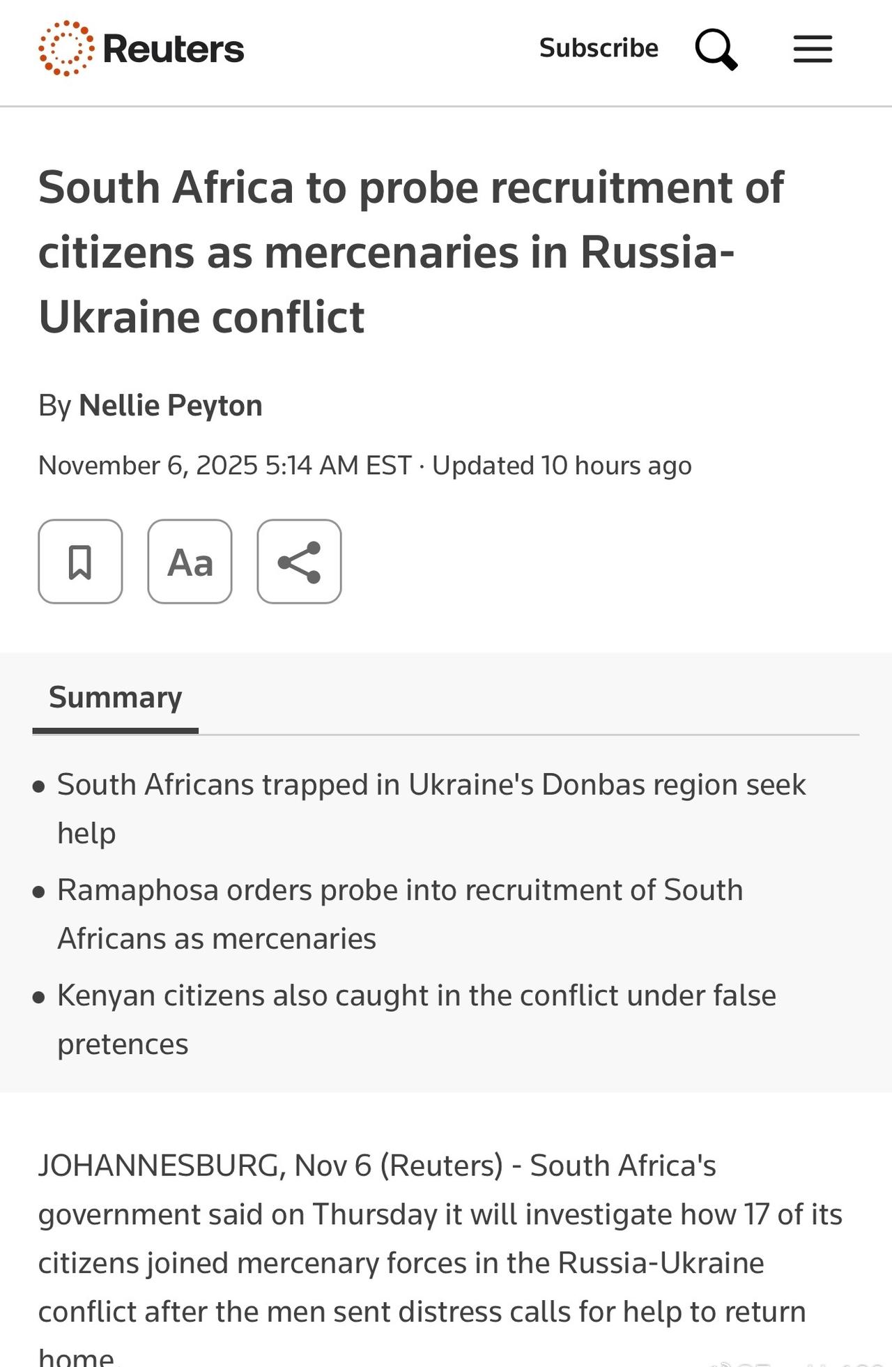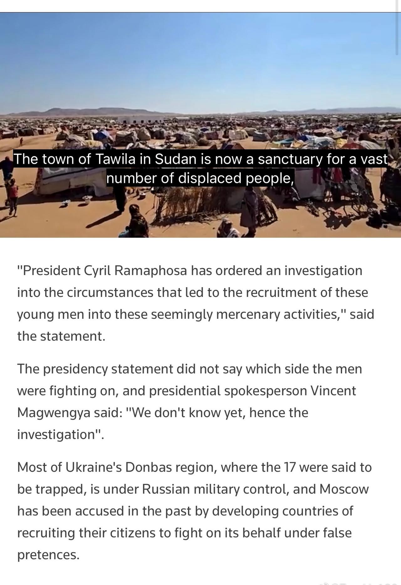 路透社報道,南非政府表示,已收到17名公民的求救訊號,他們加入了參與俄烏衝突的僱傭軍,政府正在努力安排他們回國。 聲明稱,這些人被以高薪工作合約為誘餌騙入戰場。他們年齡都在20歲至39歲之間,被困在飽受戰火蹂躪的頓巴斯地區。