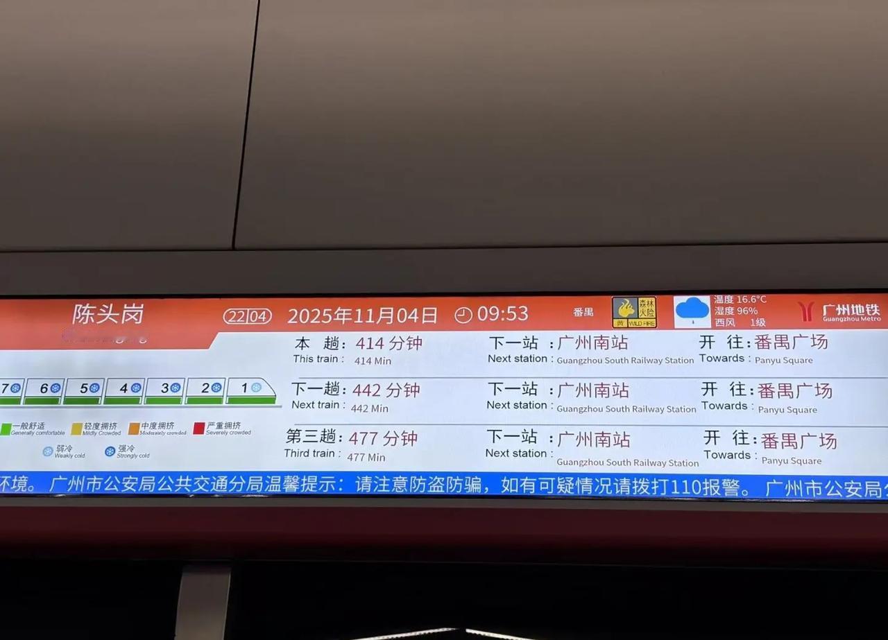 广州地铁22号线后通段 开始测试了? 之前都是只有一个站台在工作,今天对面站台显示屏亮灯了,显示400多分钟 轨道交通