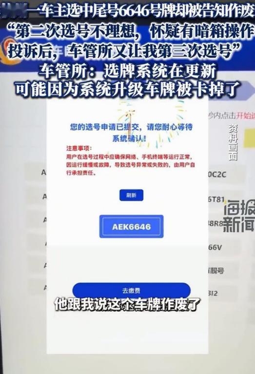 “这下真的解释不清了!”浙江杭州,男子摇车牌号,摇出了一个“6646”,车主觉得这号挺好,可下一秒系统却提示他此号作废,非让他重新选一次。 “刚选好的号怎么说作废就作废?这不是耍人吗!”杭州史先生(化姓)的遭遇引起不少车主的关注,大家表示自己也曾遭遇过这种情况。 10月31日,原本满心欢喜选中尾号“6646”的吉祥车牌,还没来得及高兴就被泼了冷水。工作人员告诉史先生“因系统故障号码作废,必须重新选择”。 史先生的愤怒可想而知,选号成功却因系统问题被强制作废,二次选号只能捡别人挑剩下的,这种落差换谁都难以接受。 更让人难以接受的是,第一次选号时系统顺畅弹出“靓号”,一到缴费环节就精准“卡壳”,难怪会让人怀疑背后有猫腻。 车管所后来给出“系统升级延迟”的解释,听起来合理却经不住细想:既然知道要升级,为何不提前公示暂停业务?明知可能会出现故障,为何没做好应急预案?这分明是把规则不合理的锅甩给了“技术问题”。 退一步说,就算真的是系统原因导致缴费失败,也不应该强制要求车主重新选号。史先生从选号到缴费全程操作合规,甚至保留了选号成功的截图,这种情况下被剥夺选中的号码,本质上是公共服务机构将自身过错,转嫁给用户承担。 正如文章开头所说,史先生的遭遇并非个例。如果这次史先生没有坚持投诉,是不是只能和其他车主一样吃下这个哑巴亏?而那些因系统故障没被选中的“靓号”又会进入到哪里? 其实公众真正在意的,从来不是一个车牌号码的得失,而是公平、透明的流程。如果选号系统能实时公示运行状态,如果故障发生后能第一时间给出详细说明,如果争议号码能核查恢复而非直接作废,所谓的“暗箱操作”的质疑自然会烟消云散。 毕竟,信任的建立需要细节支撑,一句“系统故障”远不如一套有效的应急方案更有说服力。最终,史先生得到了第三次选号的机会,但这场风波留下的疑问远未解决。 公共服务的本质是为人民服务,技术应当是保障公平的工具,而不是暗箱操作的“保护伞”。当“6646”这样的号码被系统莫名收回时,被作废的不仅是一个车牌,更是公众对公共服务的期待。 希望这次事件能真正敲响警钟:有关部门在享受数字化转型带来便利的同时,不能只停留在设备上,更要补上人文关怀和制度保障。否则再先进的系统,也只是冰冷的机器而已。 对此你有什么看法?欢迎在评论区留言讨论。公共服务 摇号 信息来源: 中华网·新闻|2025-11-1车管所回应选中6646号牌被作废 系统故障引质疑 闪电新闻|车主新车选号看中尾号6646 缴费瞬间号码竟遭强制作废 文|墨海 编辑|史叔