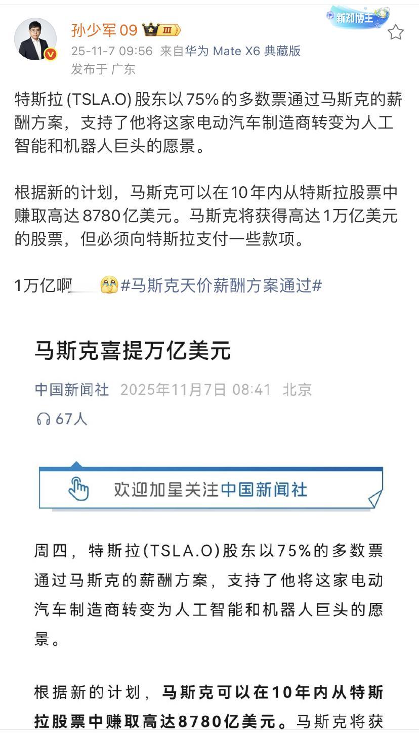 孙少军:特斯拉(TSLA.O)股东以75%的多数票通过马斯克的薪酬方案,支持了他将这家电动汽车制造商转变为人工智能和机器人巨头的愿景,10,000亿美元呀[融化][融化][融化] 特斯拉以后不能单单看作一个普通的汽车公司了。是横跨多元业务的一家新型公司,特别是现在非常爆火的ai和机器人,特斯拉公司均有涉及。 国内其他公司要想这样做的话,其实也挺容易的,就是按照特斯拉的路线在走就可以了,好多新势力造车就是这个路线,其中小鹏汽车与特斯拉最为接近。因为小鹏他也有机器人,只是在ai方面还需要加强。 各位是怎么看的?欢迎评论区留言。