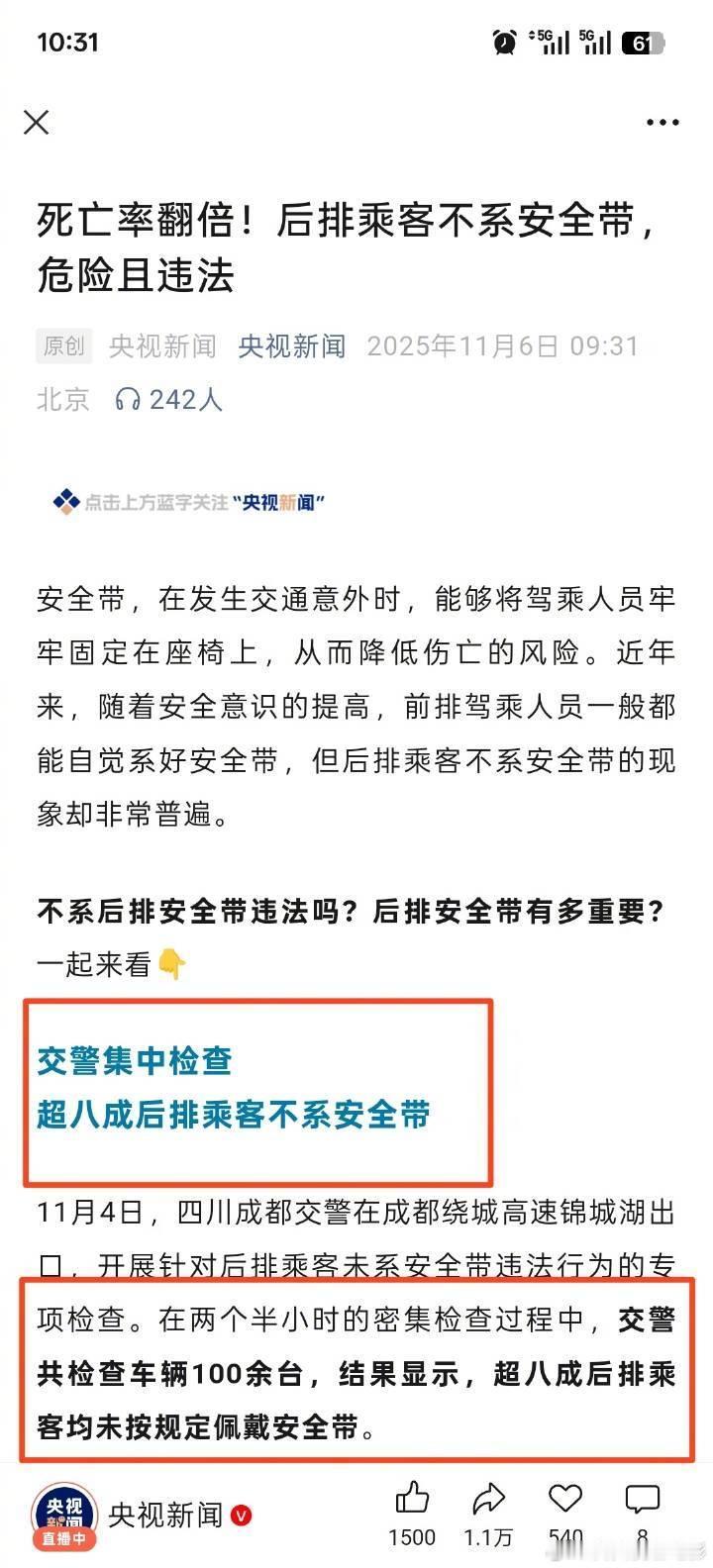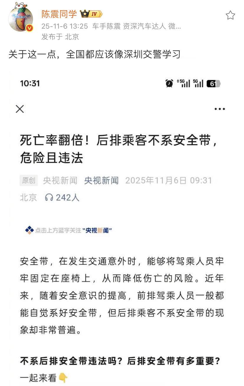陈震:关于这一点,全国都应该向深圳交警学习!大家觉得得后排应该带安全带吗? 好像很多人坐车都习惯后排不带安全带,特别是大家打的的时候,基本上很少看到有人会带安全带。 但是上高速带安全带的比例就大幅度增加了,基本上都会提醒所有人戴安全带。 各位是怎么看待这种现象的?欢迎评论区留言。