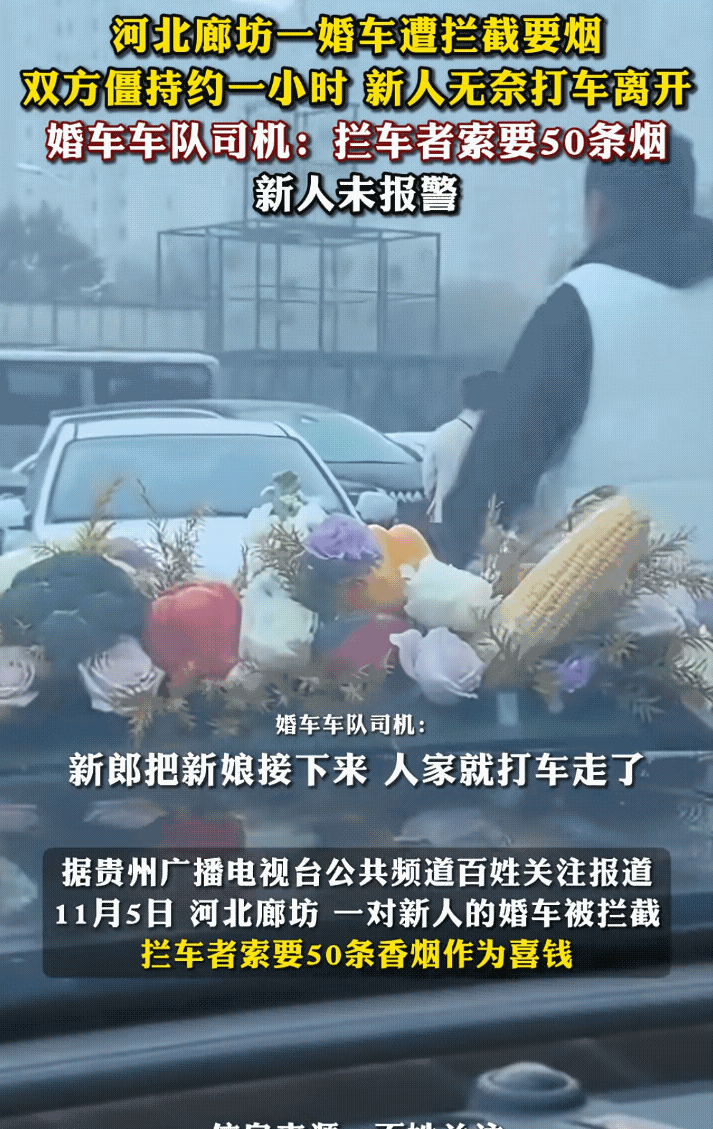 “简直就是强盗!”11月5日,河北廊坊一对新人结婚,结果婚车遭到了陌生人拦截