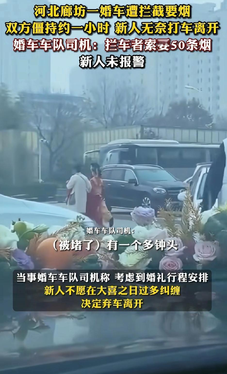 “简直就是强盗 !”11月5日,河北廊坊一对新人结婚,结果婚车遭到了陌生人拦截 ,令人没想到的是对方竟然索要50条香烟作为“喜钱” 。 不得不说这种拦车讨喜钱的做法也太令人厌烦了吧!拦车者要50条香烟作为洗钱才能让婚车通行 ,这个局面双方僵持了约有一个小时 ,后来新人想到婚礼行程安排紧凑,不愿在大喜的日子里有过多的纠缠,并没有报警 。于是决定抛弃婚车,自行离开 ,拦车的人当场傻了眼 。 此事引起网友热议 ,有网友说:“一两盒是可以的 ,50条是要开烟草公司吗 ?” 还有网友说:“听老辈人说,以前娶外地姑娘都要凌晨4点多去接亲,车都不敢开灯,出了那地界在装饰婚车。 ” 也有网友说:“这不是犯罪吗?威胁不让走,要那么多东西? ” 其实,拦婚车要洗钱,为的就是图个喜气。如果大放厥词的要那么多,真的是过分了 。而且也触犯到了法律 。支持新娘新郎的做法,不惯着他们这种不良风气 。 对此你有什么看法 ?你问我答 (信息来源于:澎湃新闻)
