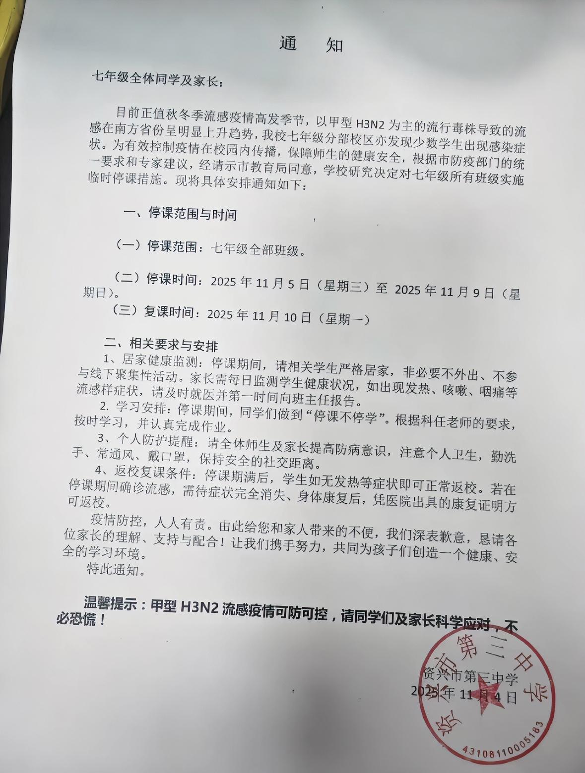 别人的学校关心孩子的健康,家长收到学校通知因冬季流感原因怕学生在班里互相传染暂时停课,停课范围全校七年级学生,停课时间11月5日到11月9日,学生在家家长监督做到停课不停学,根据老师要求完成学习任务,停课期满后学生无症状再返校。不过这波流感传染性确实较强办公室大部分同事都在感冒。
