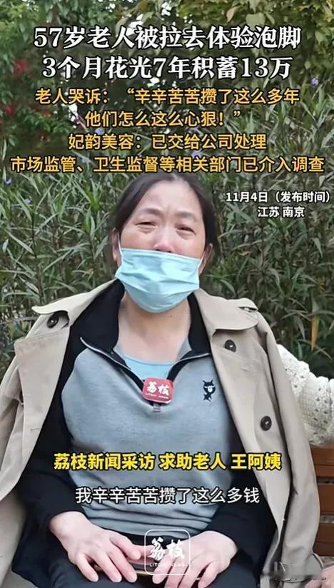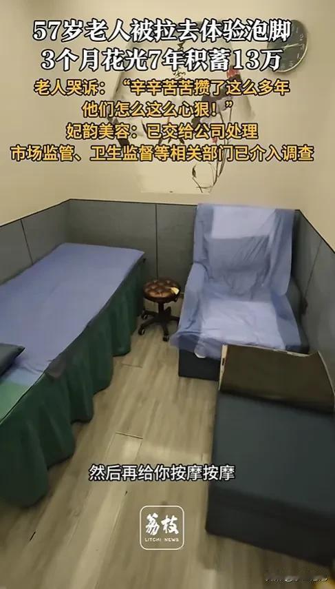 “缺大德了!”11月4日报道,江苏南京一57岁老太在家附近逛商场时,被一小姑娘邀请进店体验泡脚,老太这么一泡,便在短短3个月时间内,在店里花完7年的积蓄13万元,直到她的女儿发现阻止,老太才醒悟过来。 涉事店铺位于老太家楼下商场负一层,当日老太被店员以“免费放松”为由带入店中。据老太女儿史女士透露,店员在服务过程中不断向听力二级残疾的母亲渲染“健康风险”,称其“气血不足易中风”“经络堵塞会瘫痪”,同时展示所谓“其他老人康复案例”,逐步消解老人的防备心。 后续3个月里,店员持续向老太推荐“经络调理”“排毒药包”等项目,还以“女儿忙顾不上您,我们才真心关心您身体”的说辞进行情感诱导。老太先后支付13万元,不仅花光7年退休金,甚至向店员透露了银行卡密码,仅所谓“进口药包”就购买了二十余盒。 史女士发现母亲银行卡余额清零后,带其到店要求退款,店员以“项目系自愿购买”为由拒绝,仅表示“已上报公司处理”。老太当场哭诉:“这是我留着养老的钱,他们怎么能这么狠!” 11月4日当天,当地市场监管、卫生监督部门已介入调查。经初步核查,涉事店铺未取得医疗保健类经营许可,其销售的“药包”“调理项目”实际为普通日化产品,成本不足售价的十分之一,属于超范围经营及虚假宣传。 近年来,此类针对老年群体的消费陷阱频发:以“免费体验”引流,用“健康焦虑”施压,靠“情感绑架”促成交易,尤其针对残疾、独居老人等信息获取能力较弱的群体。此前多地已出现类似案例,部分涉事店铺甚至存在“换招牌重开”的恶意规避监管行为。 律师表示,涉事店铺的行为已涉嫌欺诈,消费者可依据《消费者权益保护法》要求退一赔三;若查证存在窃取银行卡信息等行为,还可能承担刑事责任。 目前,相关部门正督促涉事店铺配合退款,并对其经营资质、产品来源开展进一步核查。不少市民呼吁,需加强对商场周边此类店铺的日常监管,同时向老年群体普及消费反诈知识,避免养老钱再成“骗子提款机”。 各位读者你们怎么看?欢迎在评论区讨论。