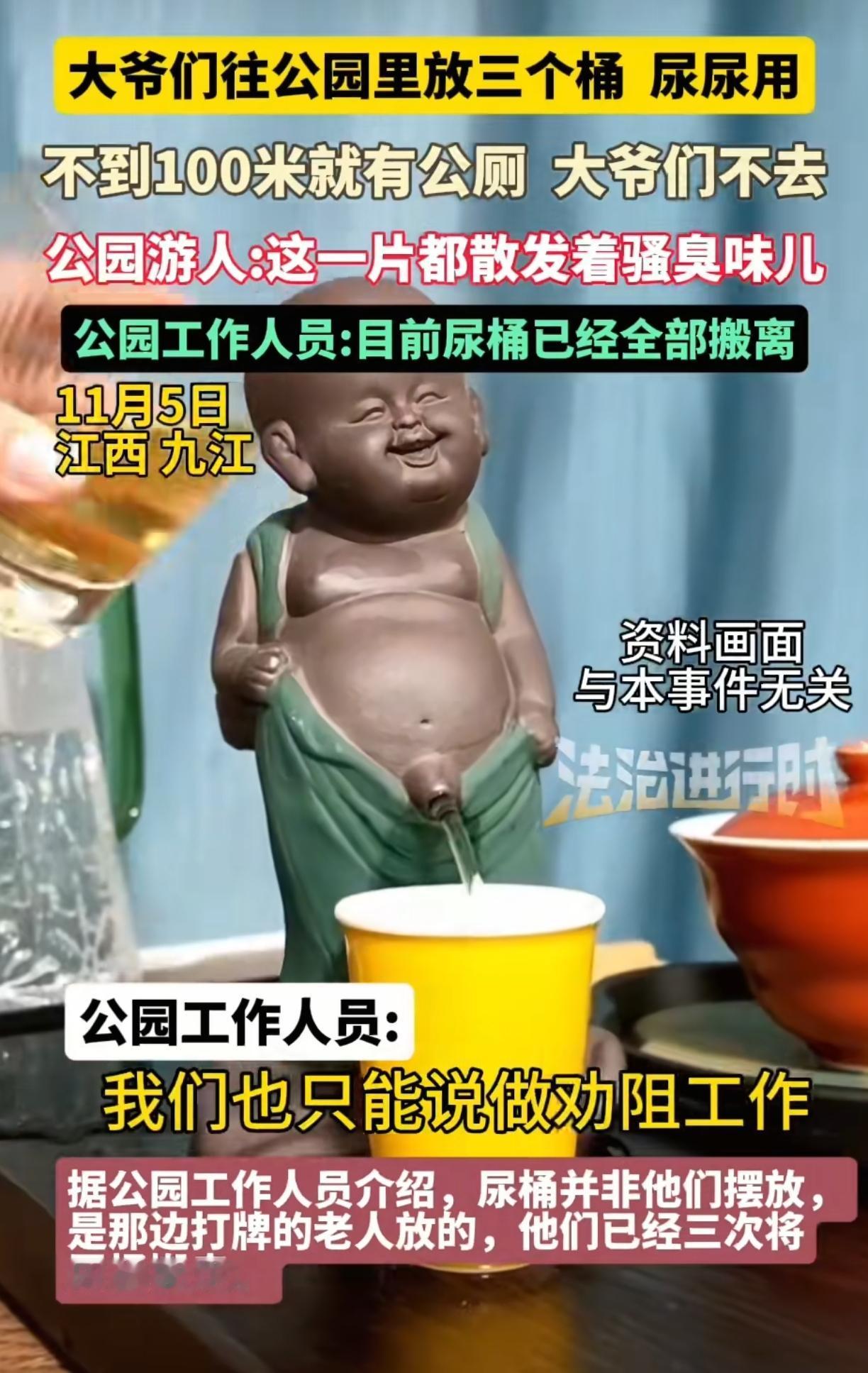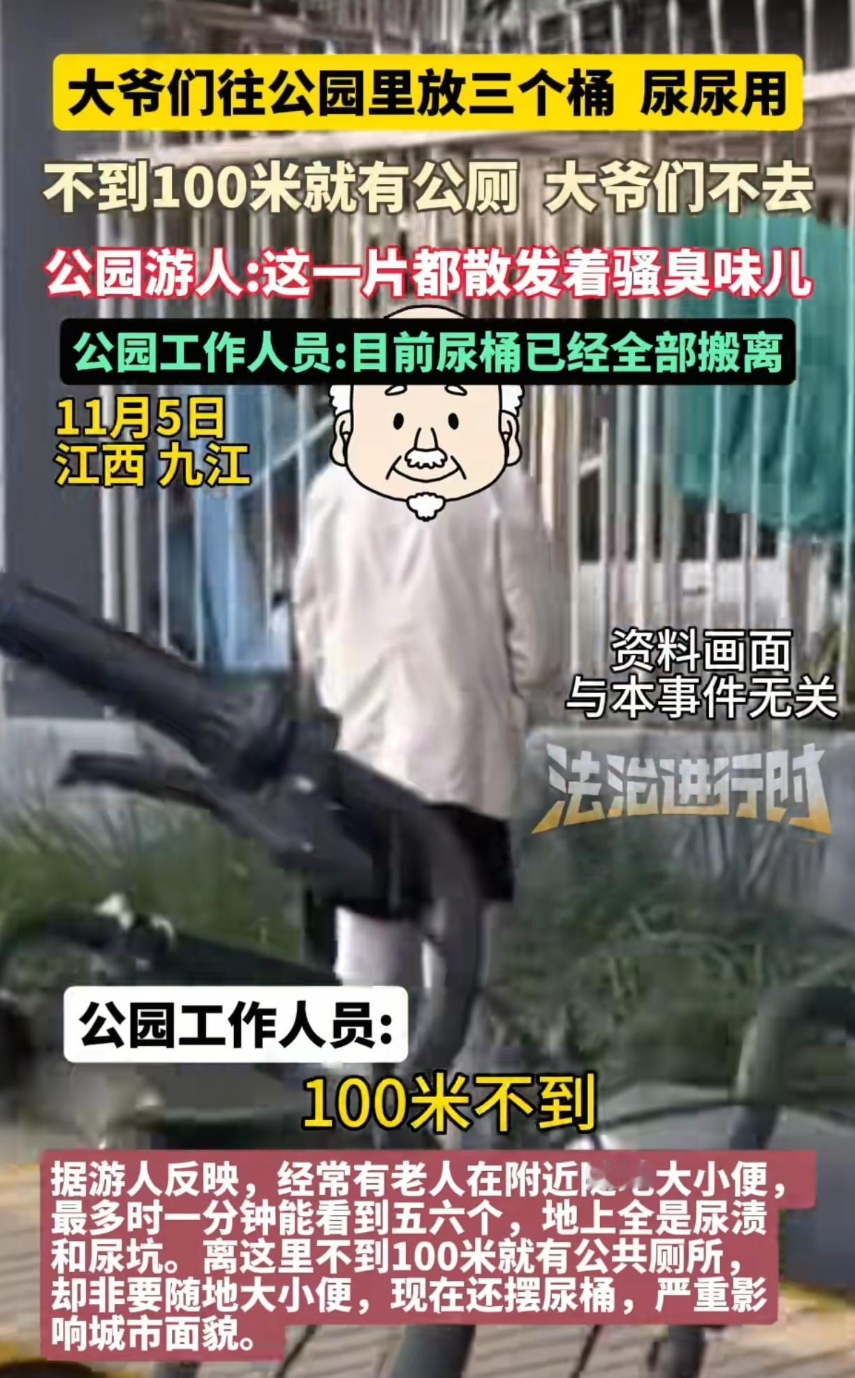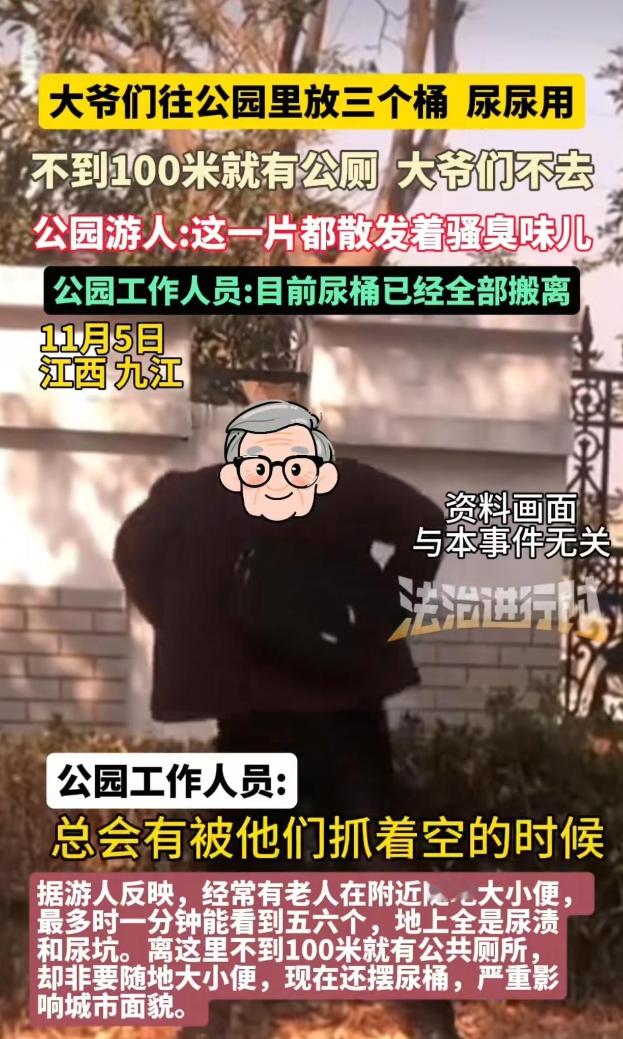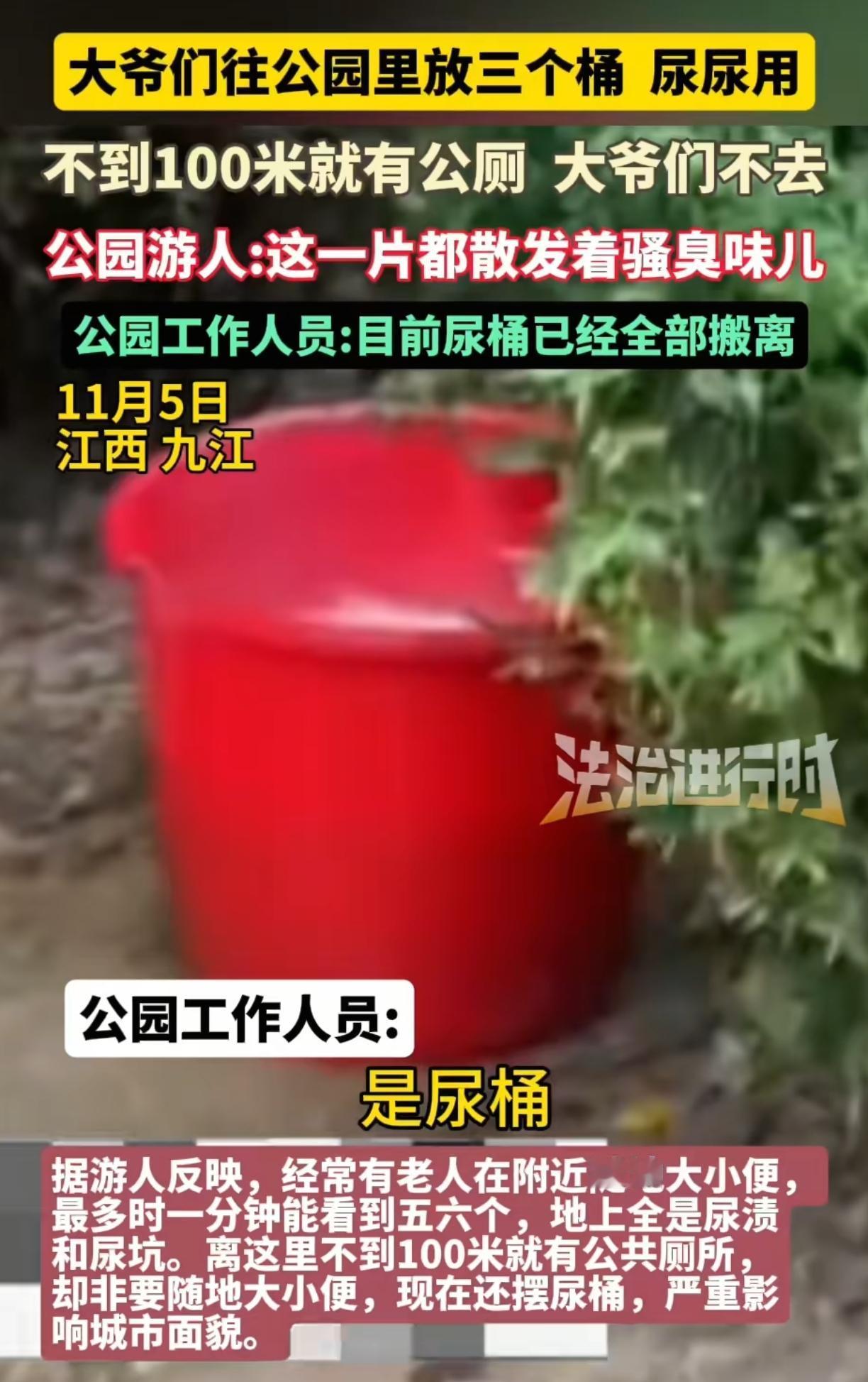江西九江,这群老大爷真过瘾,明明100米外有公厕,人家就是坚持不了,走不了这100米的路程,非在附近草地随地大小便,拒知情人说“一分钟能看到五六个站在路边尿尿的,有人走过他们也不害羞,看着年纪那都是六七十岁一个的了”,就这公园里那一个片区,尿骚味熏天,被人投诉后这些大爷竟自掏腰包买了几个大尿桶露天放置,这次不要地上就尿尿桶里面,听起来是改善了,可这随地摆放的几个大尿桶,红的黑的,搁公园里也影响市容啊,该臭的不还是一样的臭! 现在公园方回应“尿桶在被投诉以后已经搬离,这些桶是一群打牌的老人放的,对于他们的这些行为园区只能劝阻”,真是拿他们没办法啊,全靠个人自觉,但我是搞不懂,为什么有公厕不用呢,这几步路都懒得走,简直不知道说什么好,主要是这群人不是打牌就是下棋,有那么着急的吗? 倚老卖老,让工作人员难做,他就不怕他家儿媳妇姑娘看到,自己的脸不要,家人的脸面也不要了,真该晒出他们的样子,不用打码!