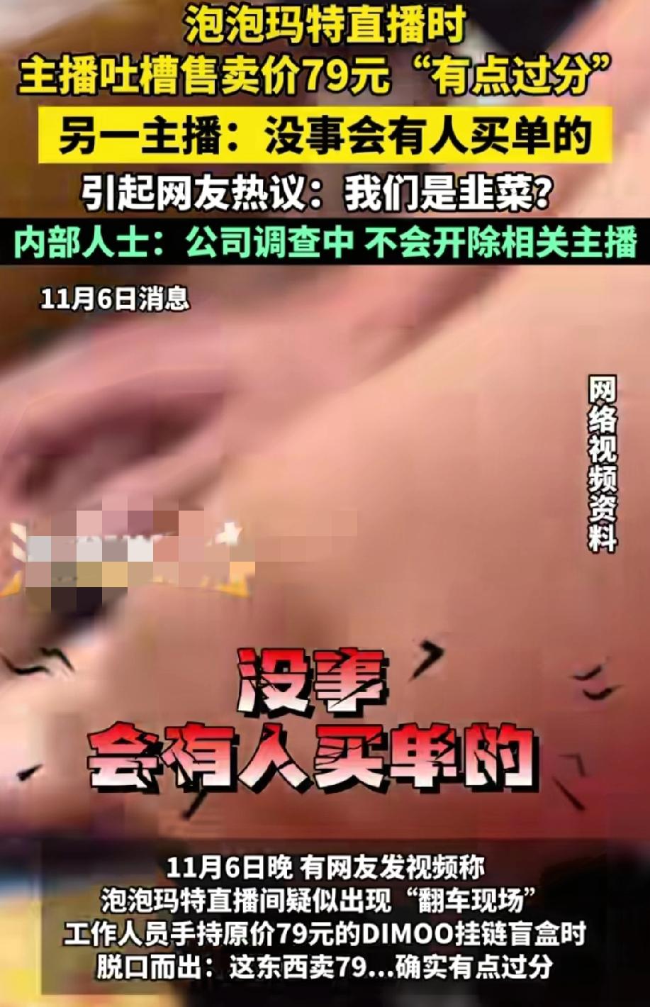 泡泡玛特直播疑似翻车 工作人员吐槽盲盒价格79元有点过分,另一工作人员回应:“没事会有人买单的”。 这件事曝出后引来网友的各种吐槽,网友说了:“我们是韭菜”? 有网友担心说这话的员工会因此丢了工作,但也有网友说了,她说的是实话有什么错? 根据内部人员透露,此事在调查中,不会开除相关主播。 这件事的重点不在员工说了什么,而应该考虑卖家的售卖价格合不合理,商家做生意赚钱没错,但消费者的权益也需要得到保障,消费者网购的主要目的一是方便省时间,二是想购买到物美价廉的东西。