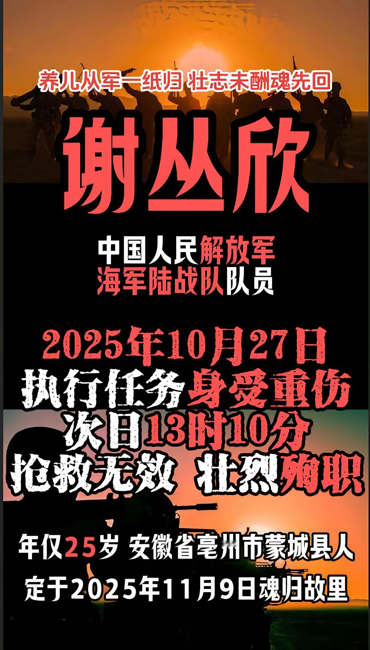 看到海军陆战队员,谢丛欣父母发出的讣告,心里特别难受,才25岁啊 哪有什么岁月静好,不过是有人替我们负重前行。 他母亲上个月还在朋友圈晒儿子的奖章,五年军旅生涯,七枚沉甸甸的奖章。连续三年“四有”优秀战士、三级国防纪念章、海外服役经历……年年都是先进,处处都是标兵。这些荣誉背后,是多少个日夜的坚守和付出。 有人追逐热搜上的明星动态,有人静默守护着国门。 谢丛欣就是那个默默守护的人。他付出的,是青春,是热血,最终是生命。 这样的年轻人走了,痛心的何止是他的父母?但凡懂得家国情怀的人,都会为之心碎。 我们该怎么做?至少,要让更多人知道谢丛欣的名字,知道有这样一位英雄曾经为我们守护和平。他值得我们铭记,值得这个时代给予最高的敬意。 致敬谢丛欣战友,致敬所有默默守护我们的英雄。 也请记得,在我们享受的每一份安宁背后,都站着无数个像谢丛欣这样的人。他们值得我们看见,更值得我们永远怀念。 希望谢丛欣的父母保重身体。你们的儿子,是真正的英雄。