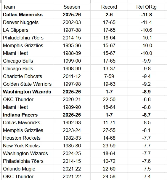 独行侠目前的相对进攻效率值为-11.8,创下了NBA历史最差纪录。 相对进攻效率简称Rel ORTG,是球队的进攻效率-当季联盟平均进攻效率。 随后快船记者转发了此条动态并配文:比1988年的快船更差并非易事。