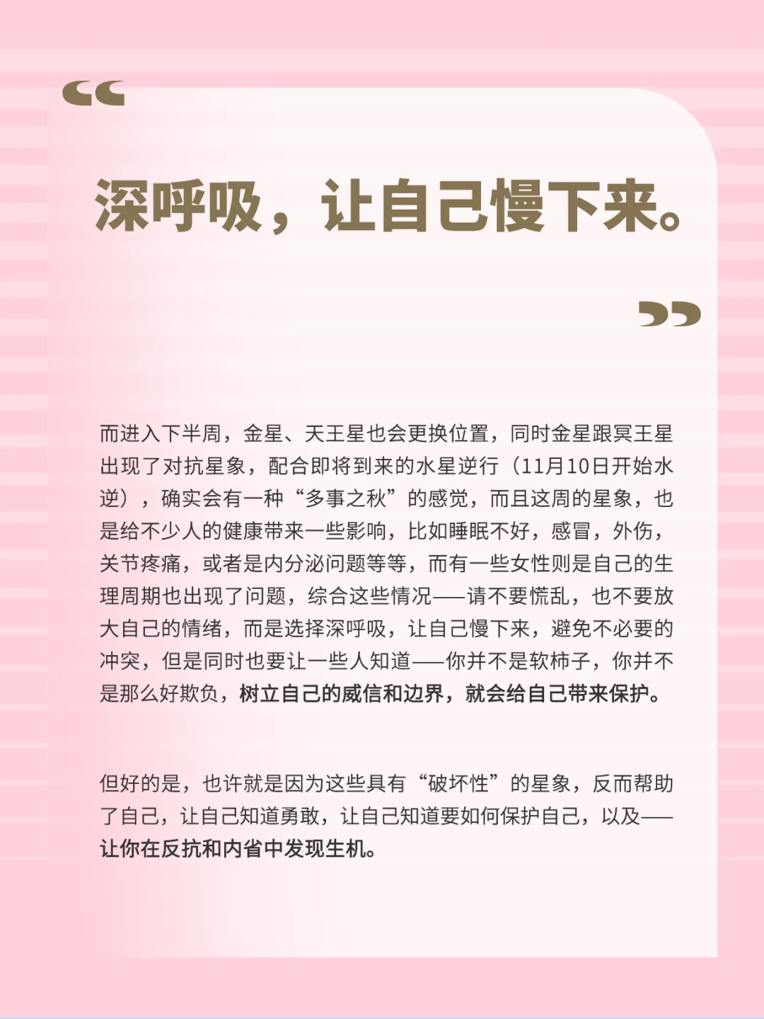 而进入下半周,金星、天王星也会更换位置,同时金星跟冥王星出现了对抗星象,配合即将到来的水星逆行(11月10日开始水逆),确实会有一种“多事之秋”的感觉,而且这周的星象,也是给不少人的健康带来一些影响,比如睡眠不好,感冒,外伤,关节疼痛,或者是内分泌问题等等,而有一些女性则是自己的生理周期也出现了问题,综合这些情况——请不要慌乱,也不要放大自己的情绪,而是选择深呼吸,让自己慢下来,避免不必要的冲突,但是同时也要让一些人知道——你并不是软柿子,你并不是那么好欺负,树立自己的威信和边界,就会给自己带来保护。