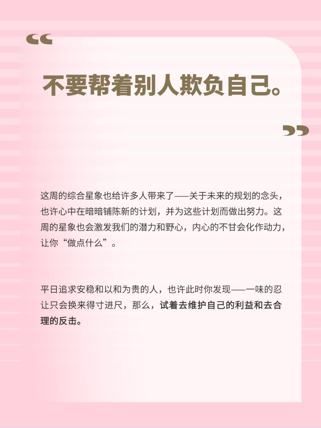 这周的综合星象也给许多人带来了——关于未来的规划的念头,也许心中在暗暗铺陈新的计划,并为这些计划而做出努力。这周的星象也会激发我们的潜力和野心,内心的不甘会化作动力,让你“做点什么”。