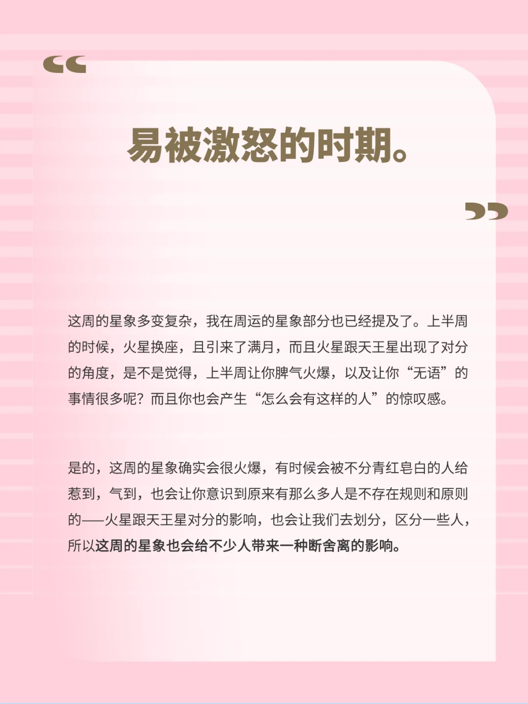 是的,这周的星象确实会很火爆,有时候会被不分青红皂白的人给惹到,气到,也会让你意识到原来有那么多人是不存在规则和原则的——火星跟天王星对分的影响,也会让我们去划分,区分一些人,所以这周的星象也会给不少人带来一种断舍离的影响。