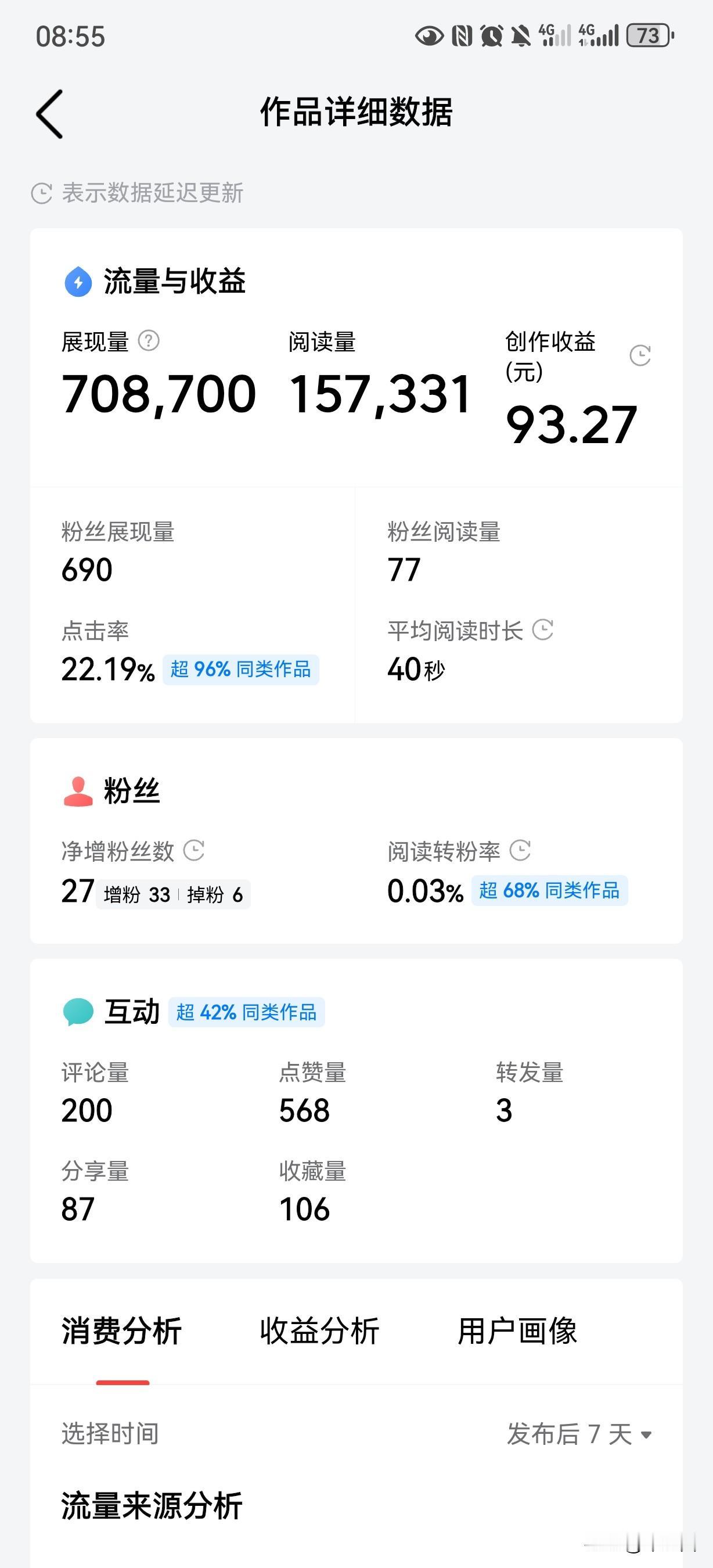 这两周阅读量达到10000,昨天还没有收到66元奖励的小伙伴不要着急,我给大家咨询客服了,第一周的到账时间是11.9号24点前,第二周的到账时间是11.16号24点前。 这个是邀请制,没有收到的也不要灰心,持续写是一方面,最重要的是不要被扣信用分。这两天有好多因为写医生的事被扣了5-20不等的信用分。你要知道信用分不足100分的肯定是不会收到邀请的。 参加个头条的活动是把收入提上去的最直接的办法,写一条顶三条,何乐而不为呢。第二周的活动还有两天了,没有达到目标的要抓紧了啊。 单日阅读量