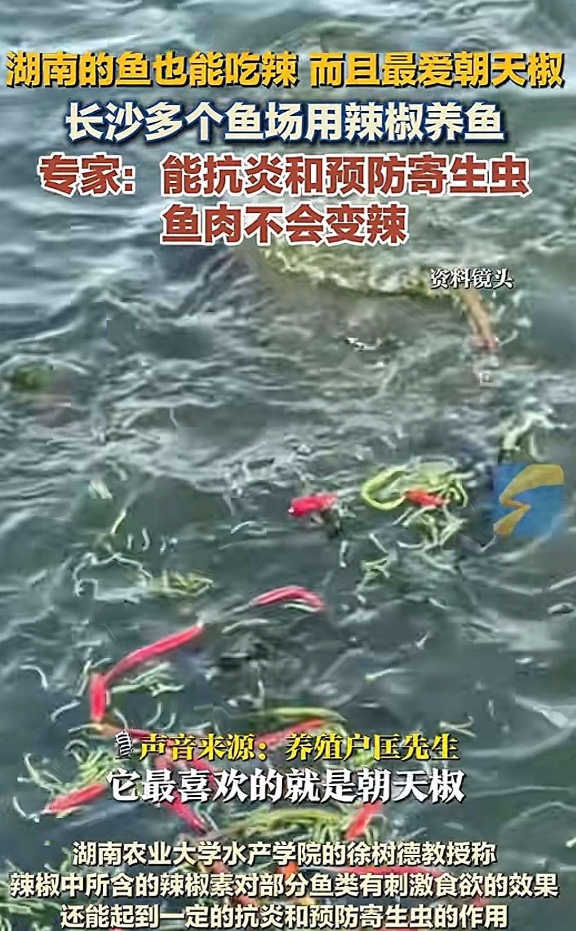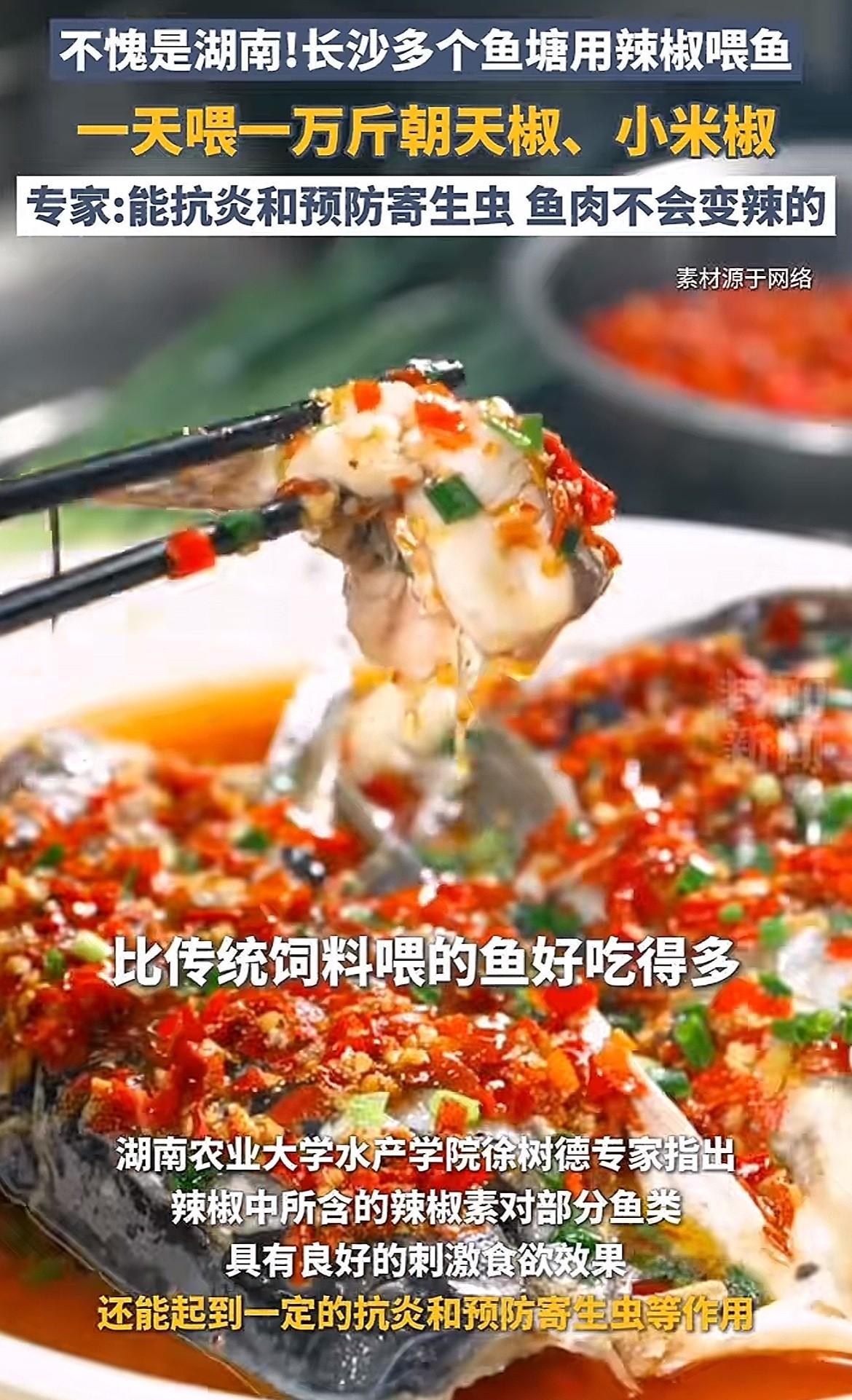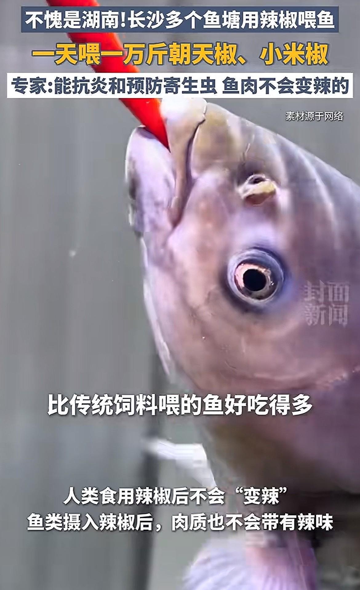 都知道湖南人喜欢吃辣椒,可我是真的没想到,竟然就连湖南的鱼也喜欢吃辣椒,这也太匪夷所思了吧? 近日湖南长沙县,一鱼塘用辣椒喂鱼引起了大家的热议,据鱼塘主人说,他家的鱼塘有60亩,养了大概2000多尾鱼,有时候一天要喂一万斤辣椒,并且还有很辣的辣椒,比如说朝天椒和小米辣!而喂鱼的这些辣椒都是附近的农户们,卖不掉的辣椒和快坏掉的辣椒,刚开始的时候鱼也是不敢吃辣椒,不过现在喂草和辣椒的话,鱼反而更爱吃辣椒,尤其还喜欢吃特别特辣的朝天椒! 另外鱼塘主人还说,这种用辣椒喂的鱼,不仅鱼的体型更漂亮,肉质更加鲜美细腻,鳞片也是金灿灿的。有专家解释说用辣椒喂鱼,还能起到一定的抗炎和预防寄生虫的作用,人吃辣椒后不会变辣,鱼吃辣椒后,鱼肉也不会超辣,因为都新陈代谢了! 关于湖南的鱼喜欢吃辣椒这事,确实是让我大开眼界了,不过在我心里还是有几个疑问,这鱼在吃辣椒的时候,难道就不怕辣吗?还是说辣椒在水里泡的时间长了,就没有了辣椒的那种辣味了?难道只有湖南的鱼,才喜欢吃辣椒呢,而别的地方的鱼,就不喜欢吃辣椒吗? #你问我答#