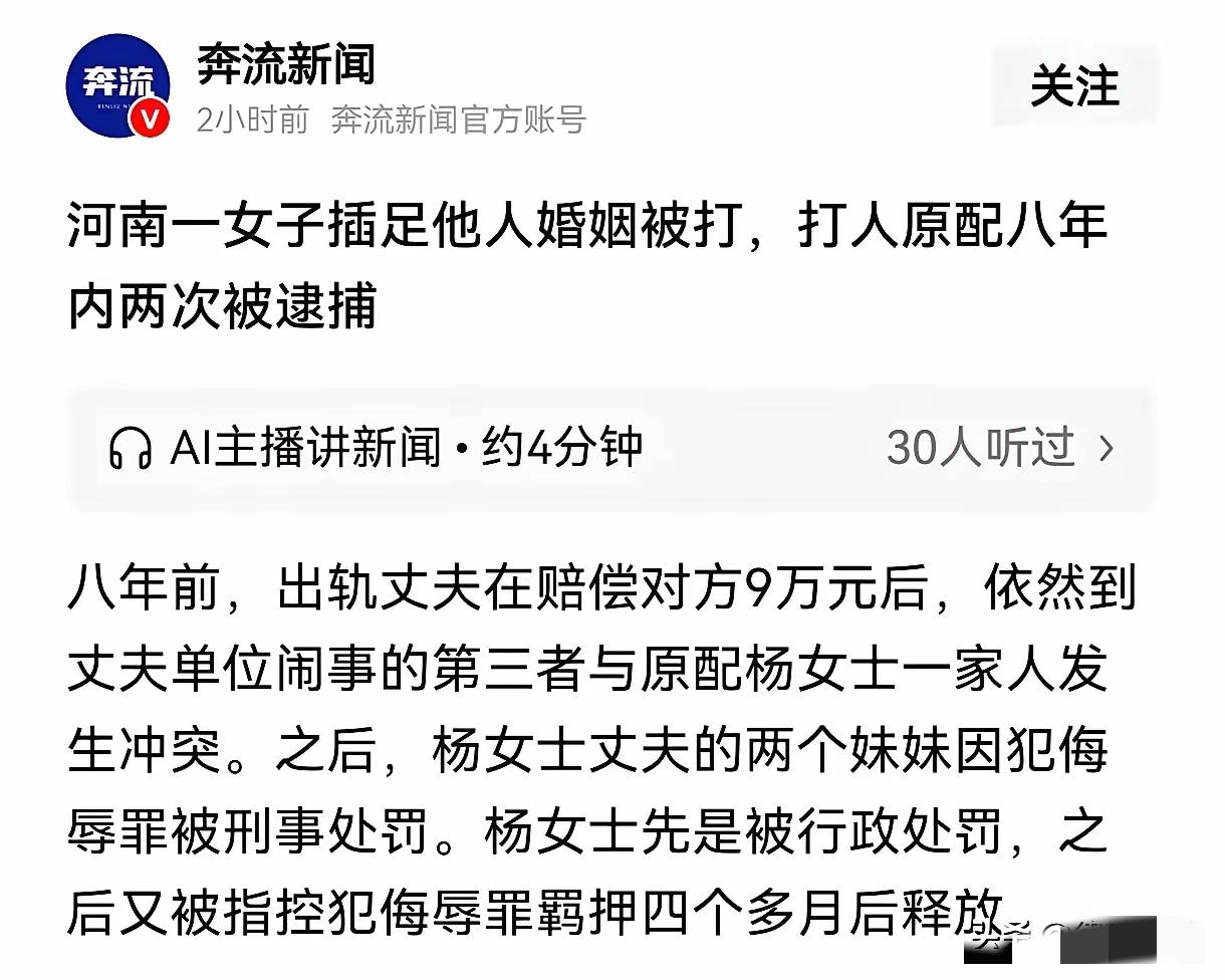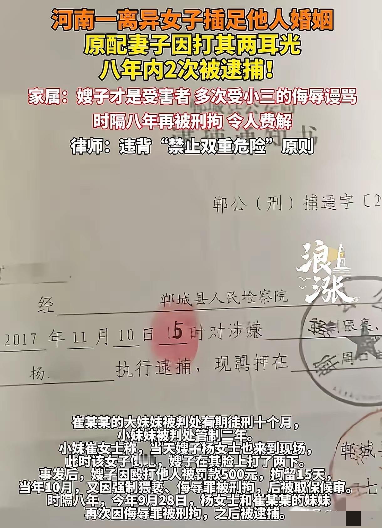 河南一男子与离异女子发生关系,女子怀孕闹到单位,男子赔9万。后男子妻子杨女士与该女子争吵,男子母亲和两个妹妹参与撕扯致女子衣被扯掉,两个妹妹因侮辱罪获刑,杨女士因扇两耳光被行政处罚。本以为事了,8年后杨女士再次被逮捕。 这事儿法律争议不小。2016年河南周口崔某某和离异女子发生关系,女子怀孕闹单位,崔某某赔9万。2017年杨女士和该女子争吵,家人参与撕扯,妹妹们因侮辱罪获刑,杨女士被行拘罚款。2025年9月,杨女士和妹妹又因侮辱罪被刑拘逮捕。 家属喊冤,称杨女士长期遭对方侮辱谩骂,时隔8年再被抓不合理。律师明确,这违背“禁止双重危险”原则,我国虽无明确立法,但司法实践中“一事不再理”是重要原则,同一行为不能反复追责。 从法律层面讲,侮辱罪是指以暴力或其他方法公然侮辱他人,情节严重的行为。但本案中,杨女士等人的行为八年前已受处罚,如今再追责,显然违背法律基本精神。就算认为当初处罚过轻,也不能突破“一事不再理”的底线。 动手打人不对,但法律的公正在于一视同仁,不能让当事人因同一行为反复付出代价。这起案件暴露的不仅是个案问题,更是对法律原则的挑战。 各位读者你们怎么看?欢迎在评论区讨论。