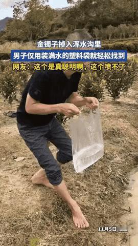 太有头脑了!福建一男子金手镯不慎掉落,滚进了旁边浑水沟里!他在水里摸了半天,也没有找到,于是灵机一动,竟然找来一个口袋,装了一些清水,然后来到水沟里,只花了3秒钟,就找到了金手镯!网友:这个是真聪明啊,这个喷不了! 急得团团转的时候他忽然想起来什么,转身去井边提了一桶水,找了个塑料袋装满水系紧口。 他举着鼓胀的袋子往水沟里放,底下突然亮堂了——塑料袋当筛子使,下面泥地上的小石头纹路都看得清清楚楚。 他晃着袋子往前挪了两下,突然看见泥缝里闪金光,一伸手就抠了出来,前后不到五秒。 有人看完视频说假,觉着镯子是藏袋子里变戏法。不过仔细看视频会发现,他捡镯子的时候分明是连塑料袋一起掏出来的,镯子在袋子外面泥上躺着,并没藏袋里头。 为啥塑料袋能起这么大作用?原来这法子跟放大镜有点像——装满水的袋子能挡住浑水里的杂质,光线不会被搅乱,底下看得清晰。 老早以前他姥姥找灶台缝隙里的硬币,也是拿发好的面团裹筷子粘,比镊子好用多了。 现在人遇到小事总想买东西解决,手机掉沙发缝就想着买金属探测器,钥匙掉了就想叫开锁师傅。 反观这个汉子,直接拿现成的塑料袋和水,倒是省心不少。 不过要是金镯子掉深水区呢?这种法子就不行了。那人后来也没说明,只说浅水区管用。 有人提意见说深水得另想办法,像是用长竿绑镜子什么的。不过这事在网上吵翻天,有人觉得聪明,有人说不可能,至今还没个结论。