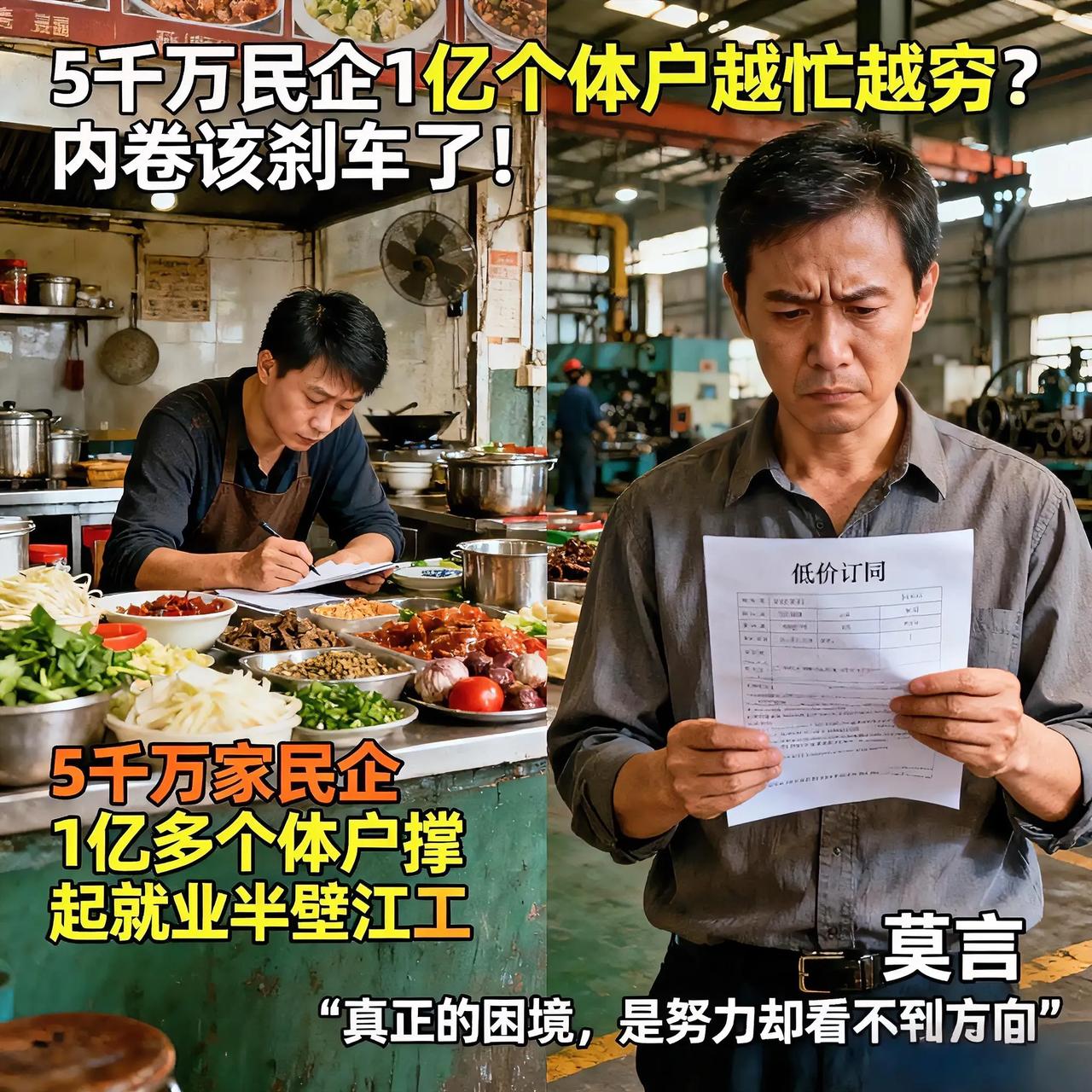 5千万民企1亿个体户越忙越穷?内卷该刹车了! 5千万家民企、1亿多个体户撑起就业半壁江山,却陷入忙到脚不沾地仍赚不到钱的困境。 莫言说“真正的困境,是努力却看不到方向”。楼下小吃店老板每天守店14小时,平台补贴战让他“赔本赚吆喝”;开小厂的亲戚,为抢订单压价到没利润,质量也难保障。2025年有增值税返还新政,但不少小微企业压根不知道。 内卷不是奋斗,是内耗。政策红利该多些直达性,商家也得跳出低价竞争。你觉得该怎么帮小微企业破局?企业内卷 民企真相 中小企业生存难 个体户困境 内卷经营 创业者求职现状 行业内卷 企业经营不景气 电商真的是伤害了实体经济吗? 民营企业内卷 个体户生存现状