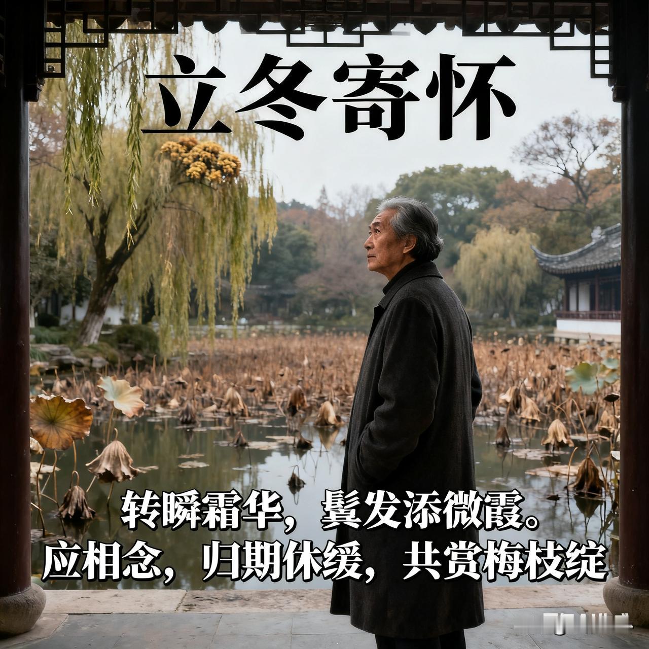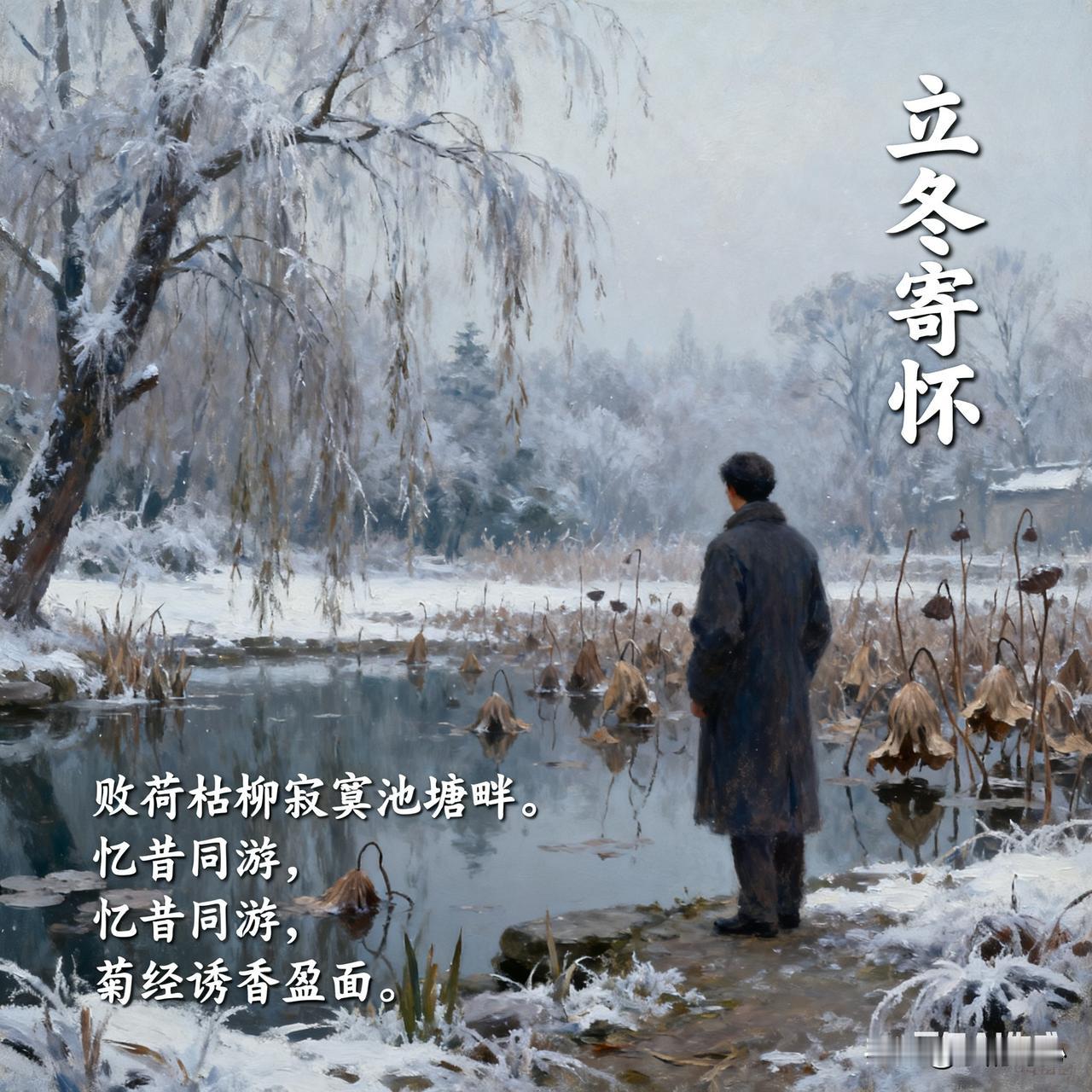 《立冬寄怀》乐韵诗心原创诗词: 秋尽冬临,朔风初起寒烟漫。败荷枯柳,寂寞池塘畔。 节序轮回,岁事如飞箭。情难断,凭栏轻叹,思绪天涯远。 忆昔同游,菊径香盈面。笑语欢颜,犹绕回廊院。 转瞬霜华,鬓发添微霰。应相念,归期休缓,共赏梅枝绽。 这首诗词的首句点明立冬节气,描绘出寒风中败荷枯柳的萧索之景。感慨时光飞逝如箭,凭栏轻叹思绪飘远。下阕回忆往昔与友人同游赏菊的欢乐场景,对比当下霜华染鬓,盼友人归期,共赏冬日梅花,抒发了对友人的思念与对冬日相聚的期待。