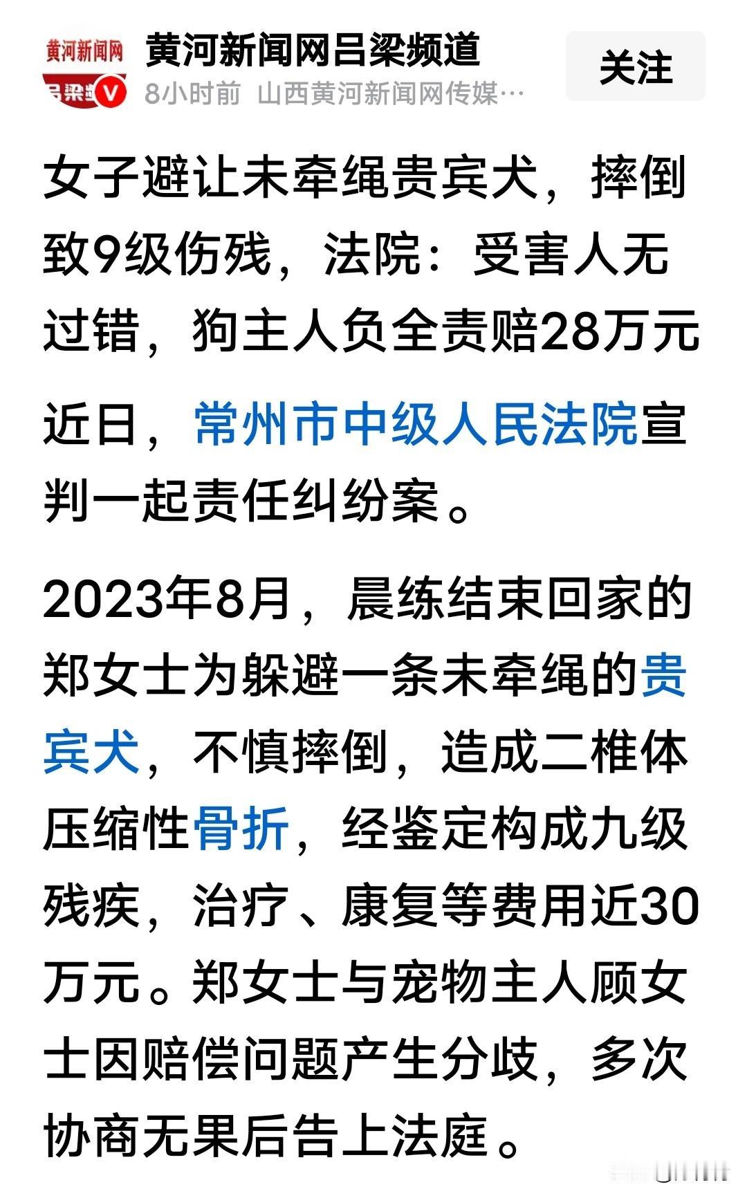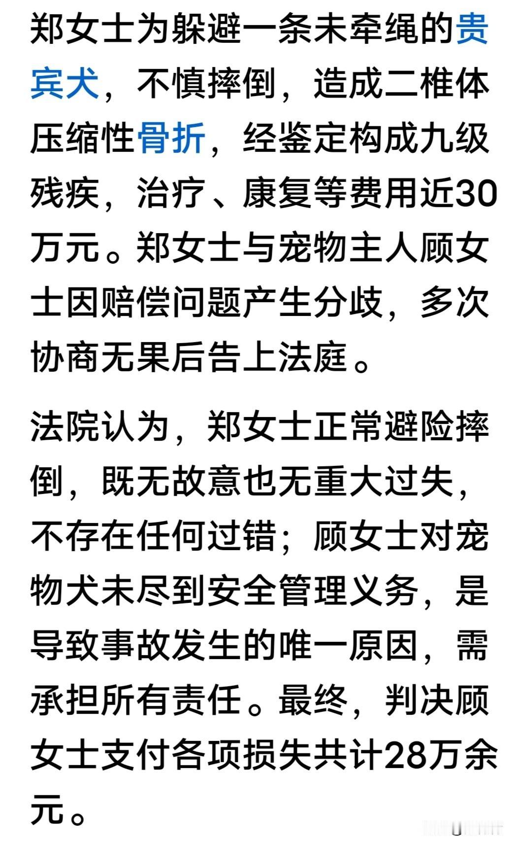 养狗人士该清醒了!因为遛狗没牵绳,女子避让摔倒致九级伤残,法院判狗主人赔偿受害人28万元。 这是常州法院宣判的一起涉狗责任纠纷。晨练结束回家的郑女士,因避让没有牵绳的贵宾犬不慎摔倒,造成二椎体压缩性骨折,经鉴定构成九级伤残。 狗主人摊上事了。郑女士多次与养狗主人交涉赔偿不成,最后诉诸法庭。法院就事论事,因为狗引起的,责任明确,结合郑女士伤残程度,判定养狗人赔偿郑女士28万元。 因为小小的疏忽,自己未拴绳的贵宾犬闯下不小祸害。法院的判赔白纸黑字写着,不是2800,那可是28万元啊。估计后悔的肝疼。 网友评论说,“这判决大快人心。法律早有明确,未对动物采取安全措施致损,饲养人担责。过去总有人钻空子说,行人也有责任,法律条文坐实了,不拴绳就是有责任。” “看看那些没有素质的养狗人,能不能从这次判决中接受教训。” “坚决支持人民法院公正判决,维护公平正义。还好,这女的遇到了包青天。”养狗伤人 摔倒判赔 宠物致伤 狗没有咬人,因为没有牵绳,受惊吓躲避致伤,判赔天价赔偿。你说养狗人亏吗?