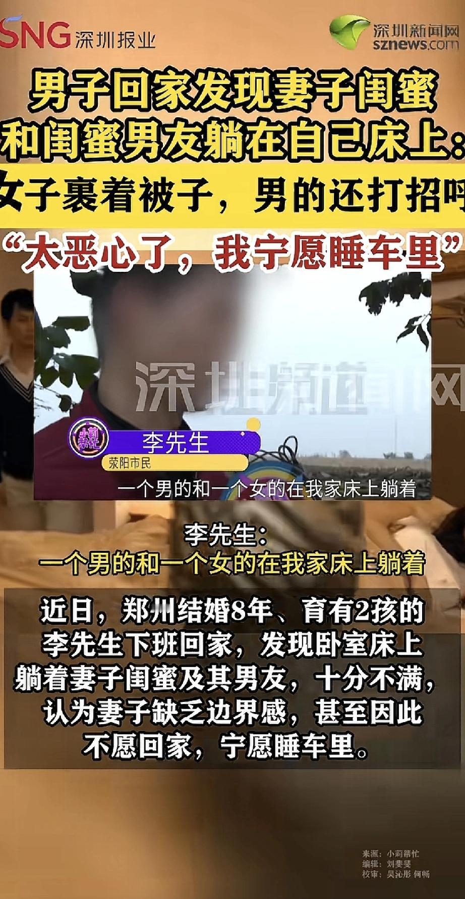 这真是让人无语!郑州的李先生辛苦一天下班回家,推开卧室门吓了一跳——妻子的闺蜜和她的男朋友,竟然躺在自家床上! 看到李先生回来,那个男的还跟他打了声招呼。李先生当场就恶心坏了,事后直接说“我宁愿睡车里也不回这家”。 结婚8年还有两个孩子,妻子却随便让外人睡自己主卧床,这确实太没边界感了。谁遇到这种事能不憋屈?家本该是最私密舒服的地方啊。