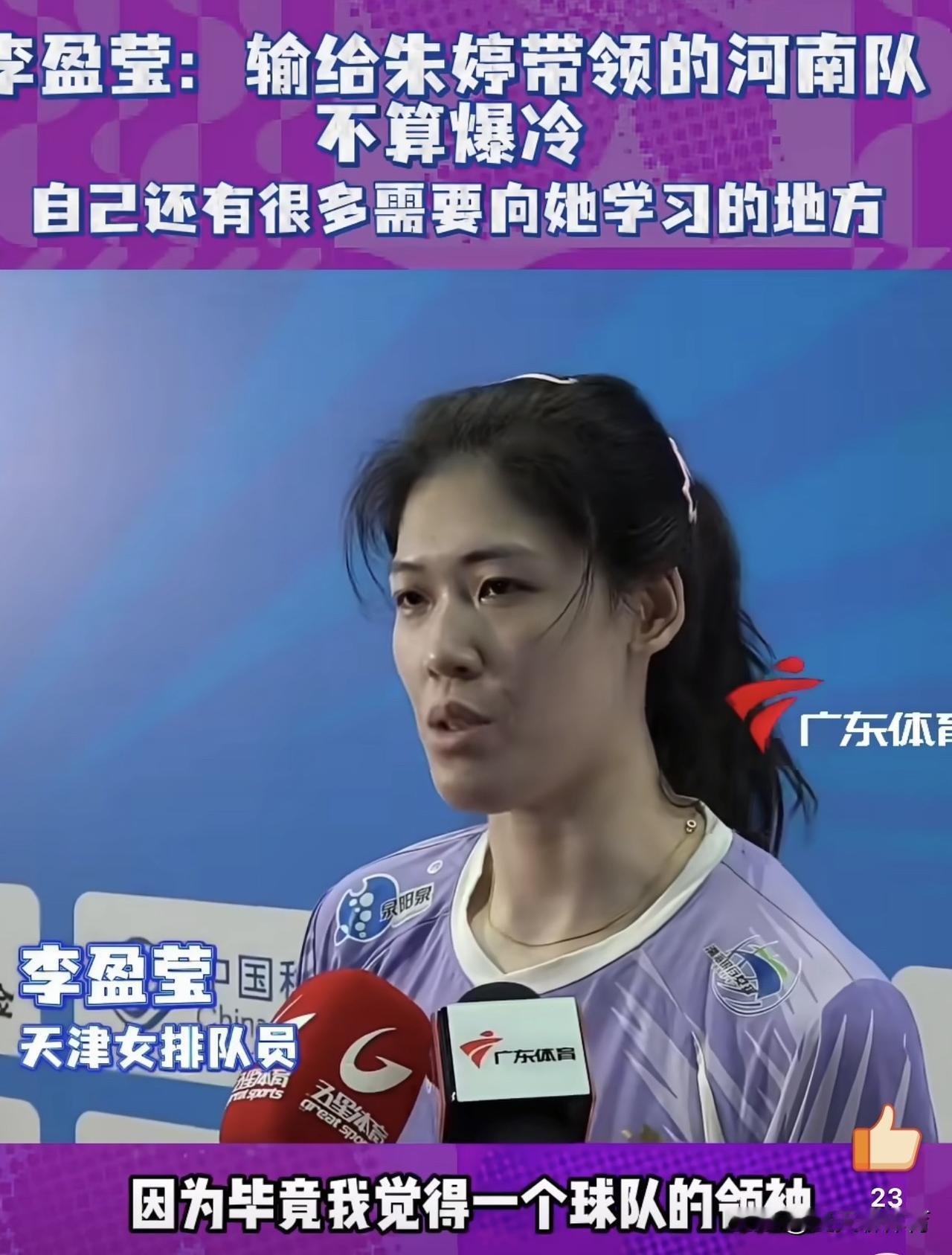 李盈莹赛后的采访真的很有格局!输给河南女排后,李盈莹面对记者采访,非常谦虚,一直在夸赞朱姐,经验和手法一直在进步,越来越老道了!还提到需要像朱婷学习的地方还有很多,不得不说李盈莹这高情商的回答[赞][赞][赞]妹妹李盈莹还没有完全恢复好啊,以为她能恢复个9成左右了,没想到今天一看比赛,感觉5成还没有恢复到,后面的比赛希望天津女排省着点用李盈莹!希望李盈莹能去意大利女排联赛练练,既然米兰俱乐部抛出橄榄枝了,我们就放李盈莹去!