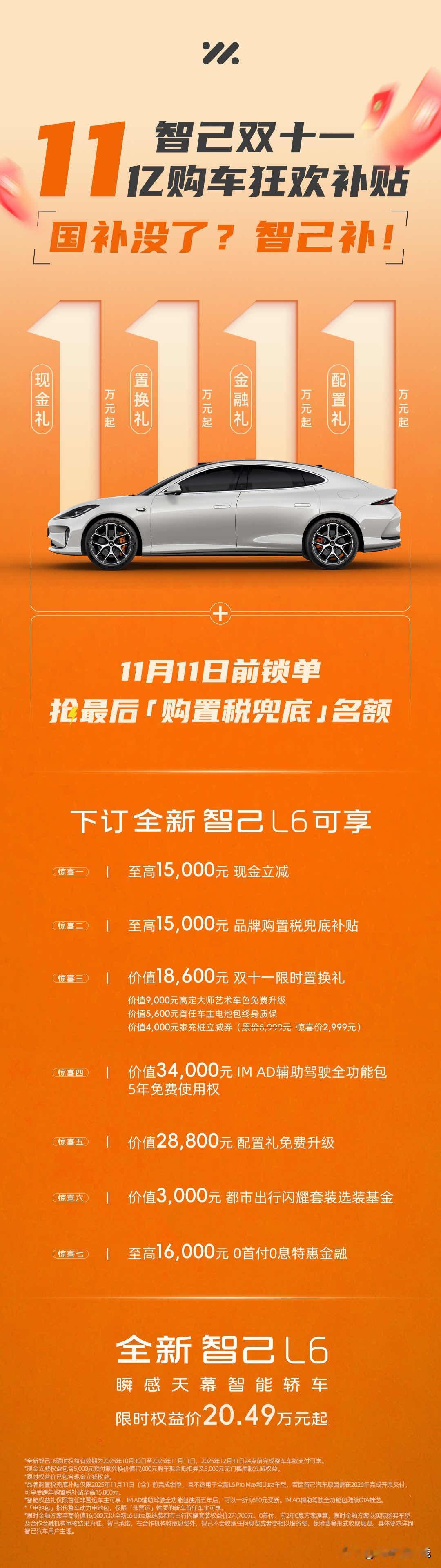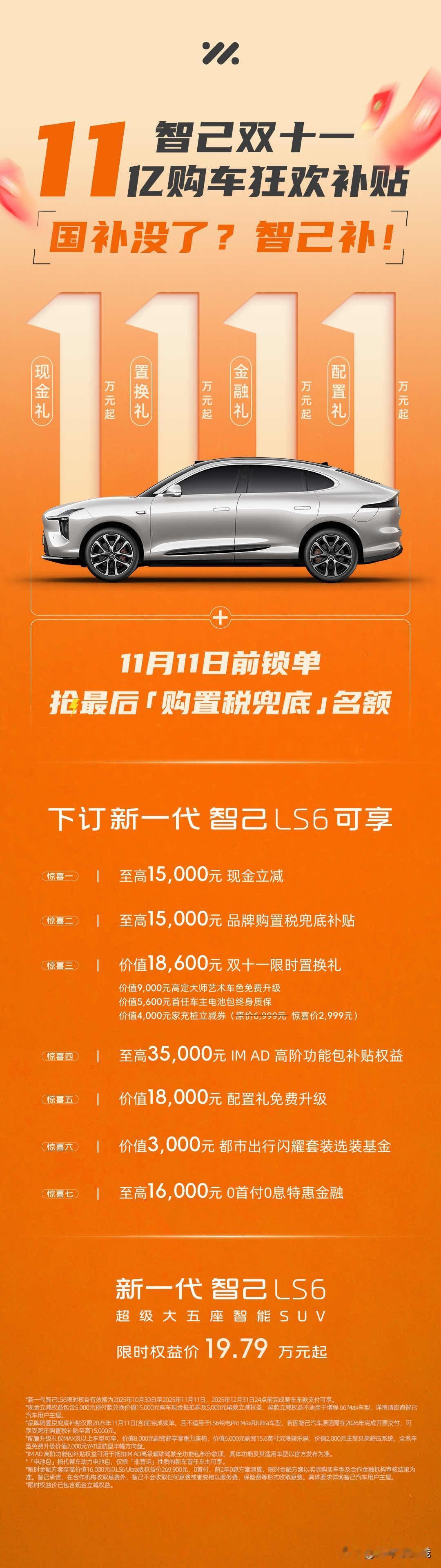 在本年度的双十一消费热潮中,智己汽车喊出 “国补没了?智己补” 的响亮口号回应广大消费者的购车需求。根据官方规则,11 月 11 日(含)前完成锁单的消费者,可尊享涵盖 “购置税兜底” 的七大购车权益,优惠覆盖智己 LS6 与 L6 两款主力车型。目前正值政策实施的最后一个周末,消费者将迎来锁定优惠的最后机会。 智己双十一补贴方案详解: 适用车型:新一代智己LS6 和 全新智己L6( Pro、Max 和 Ultra版车型除外) 关键权益:可享受至高15000元的现金立减与购置税补贴;价值18000-28800配置礼免费升级;价值34000以上的驾驶辅助功能包等。综合优惠超7万元。 权益有效期:2025年10月30日至2025年11月11日。 支付截止日:需在2025年12月31日24点前完成整车车款支付。 注:必须在购置税兜底锁单截止日2025年11月11日(含)前完成锁单才能享受。 智己品牌十月销量再创巅峰 智己汽车10月销量整体高达13,159台,再创品牌历史新高,新一代智己LS6成为销量增长的主要来源。LS6搭载的“恒星超级增程”系统提供52kWh与66kWh两种电池容量选择,纯电CLTC续航最高达450公里,综合续航突破1500公里,不仅提升了增程车的驾驶质感,还有效解决了续航焦虑。智己L6则凭借智能科技优势开辟差异化市场,搭载的IM AD 3.0智能辅助驾驶系统具备“无图城市NOA”功能,新增高速ETC通行能力,实现城区-高速全场景智能驾驶。自国庆以来至今,各地线下市场反馈同样火热,门店试驾预约量持续攀升,LS6的“超级右排”零重力座椅与L6的轿跑操控体验均成为用户换车时的关注焦点。 结语 现在正是享受智己双十一补贴政策的最后机会,消费者可通过“体验-确认-锁单”的流程实际体验后,再锁定权益。建议您首先亲赴线下门店,直接试驾感受LS6的宽适空间与L6的前沿智能驾驶科技,切身体会智己车型的与其他车型的差异化优势,进而通过门店顾问或官方详细了解适合智己车型的具体补贴方案,避免错失购车黄金期。 智己10月销量破万 新一代智己LS6双十一补贴方案