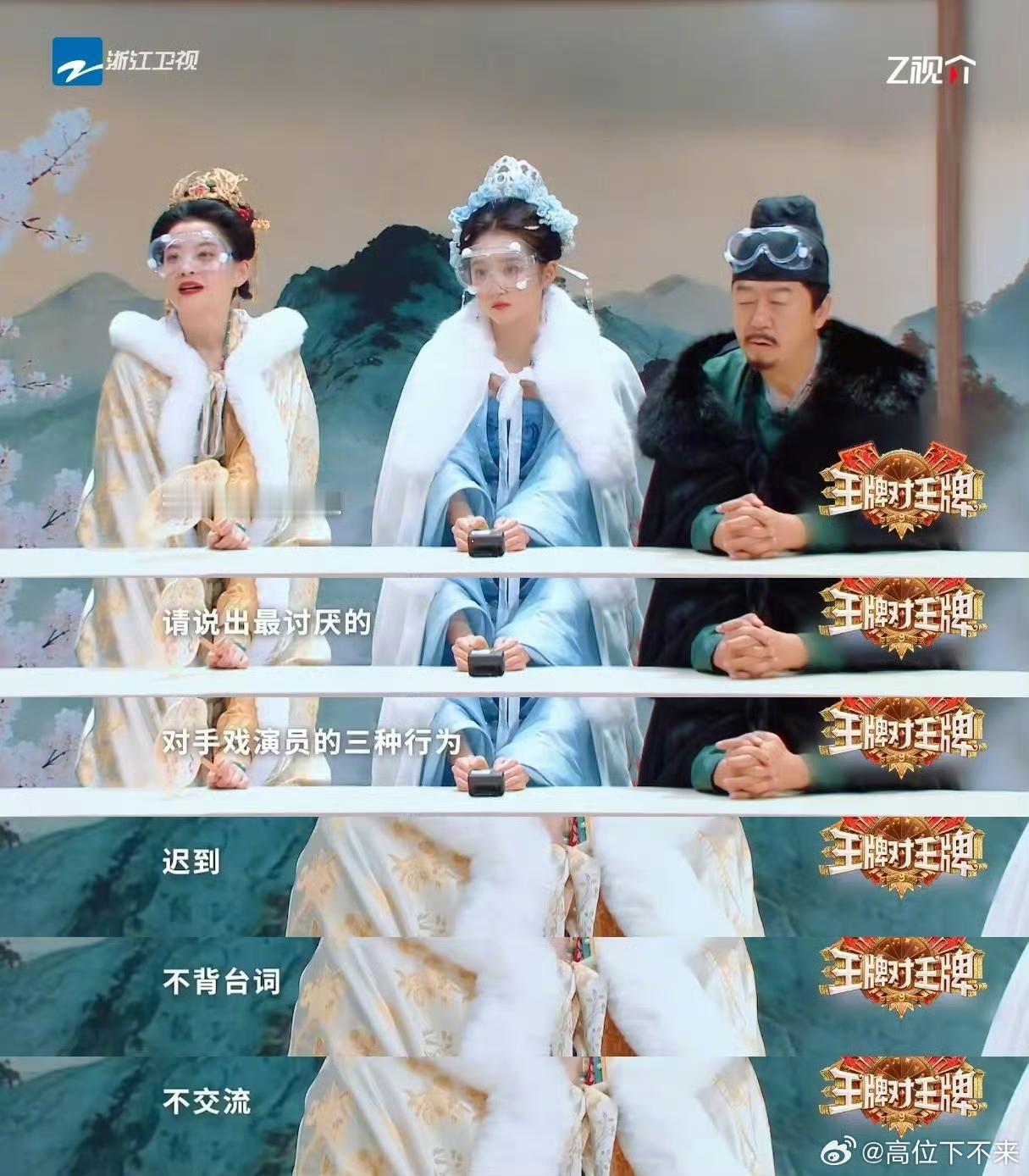媒梅婷最讨厌的演员大曝光! 《王牌对王牌》中,当梅婷被问到最讨厌演员的三种行为,她不假思索地回答:迟到、不背台词、不交流。 作为观众,我也讨厌那种要拍了才看剧本的,词是现记的,台词功底还差的要死,要命的是粉丝和公司还要营销演技。 这就跟身边那种工作能力差 工作态度不好,影响整个工作进度,导致加班,增加自己的工作量的人一模一样。 有些人有工作机会不珍惜,想要机会的确没有,娱乐圈真的该整顿一下了,没演技的不要占位了,给演技派留点机会!